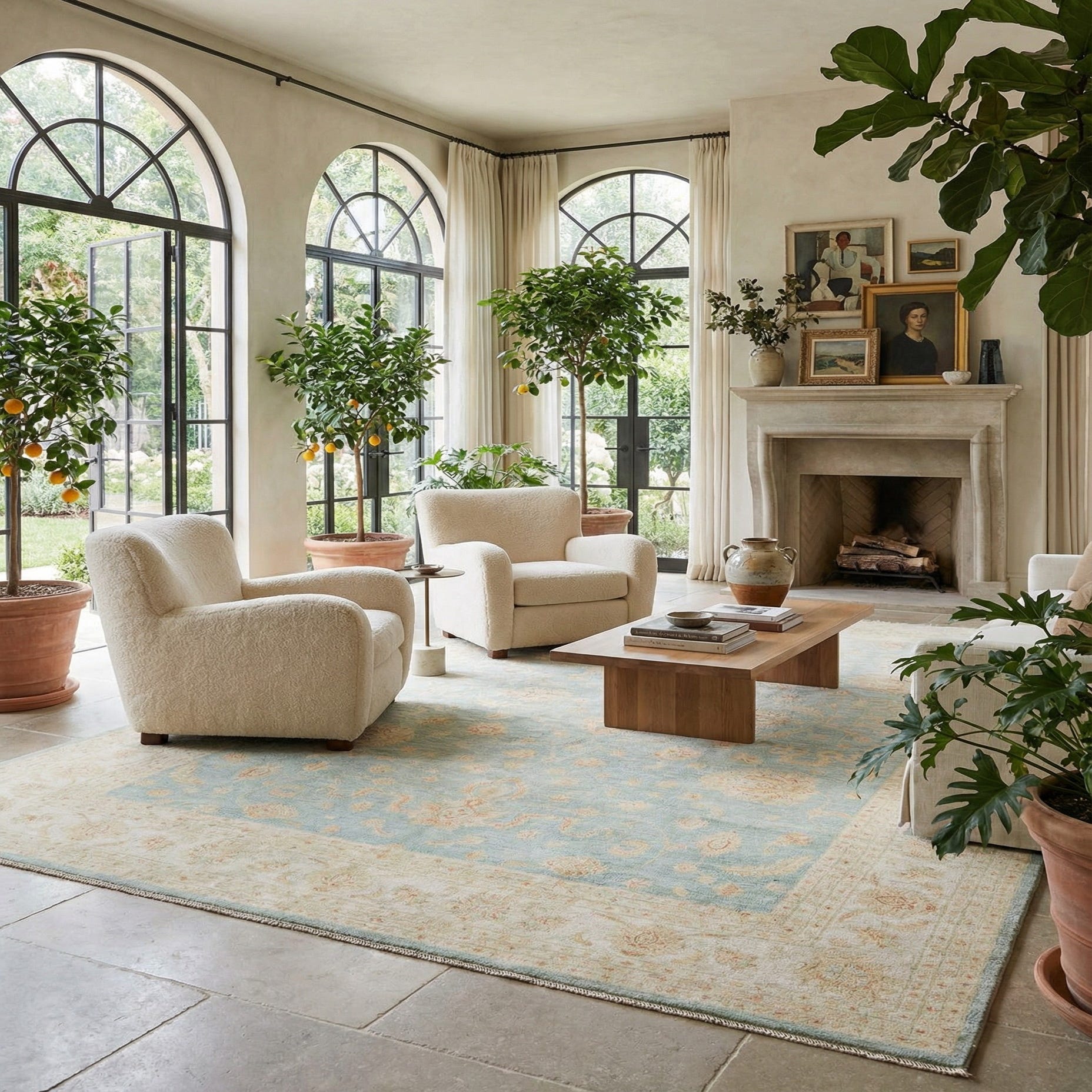 Primary color is Beige. Colors in this rug include: Beige, Beige, Blue, Cream.