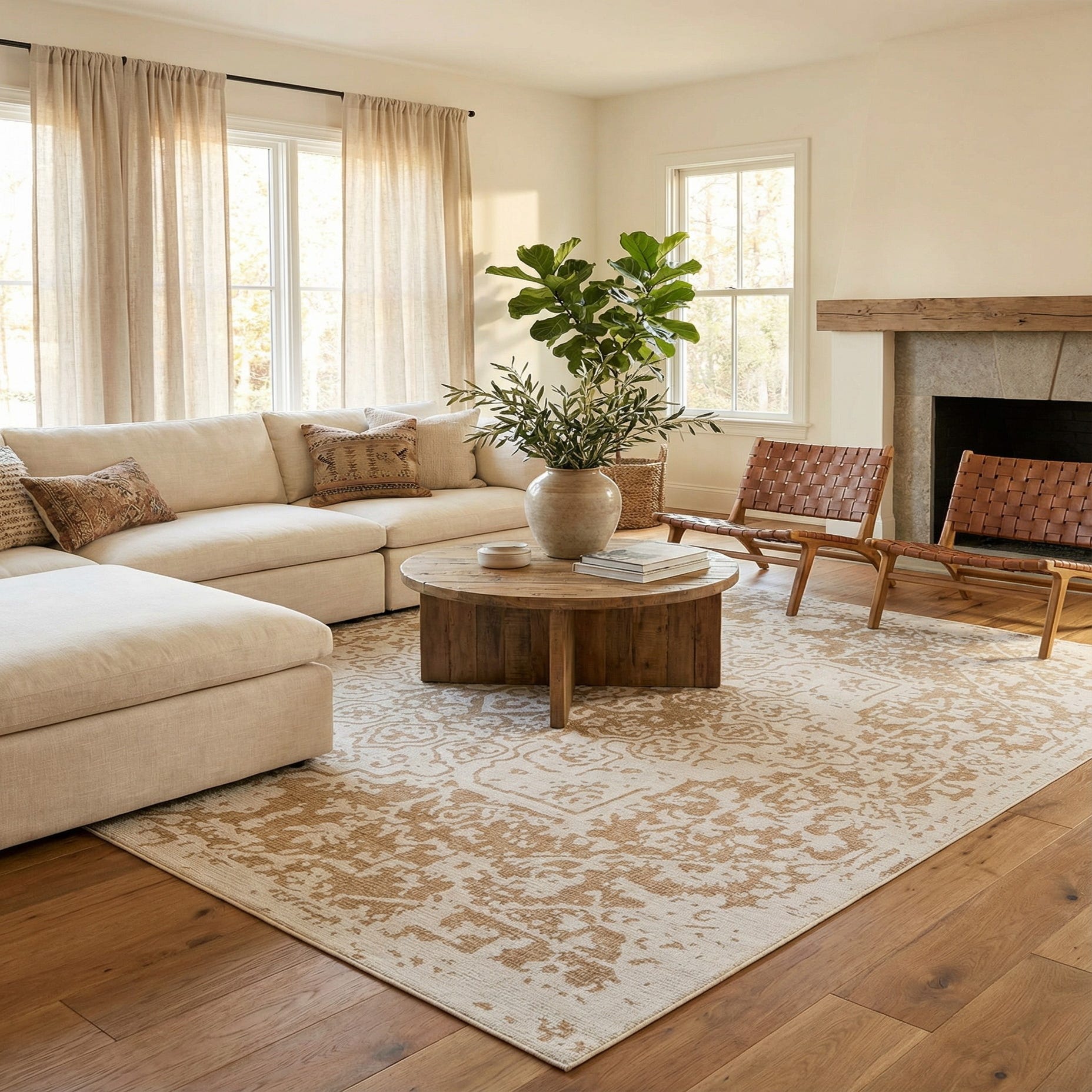 Primary color is Beige. Colors in this rug include: Beige, Brown.