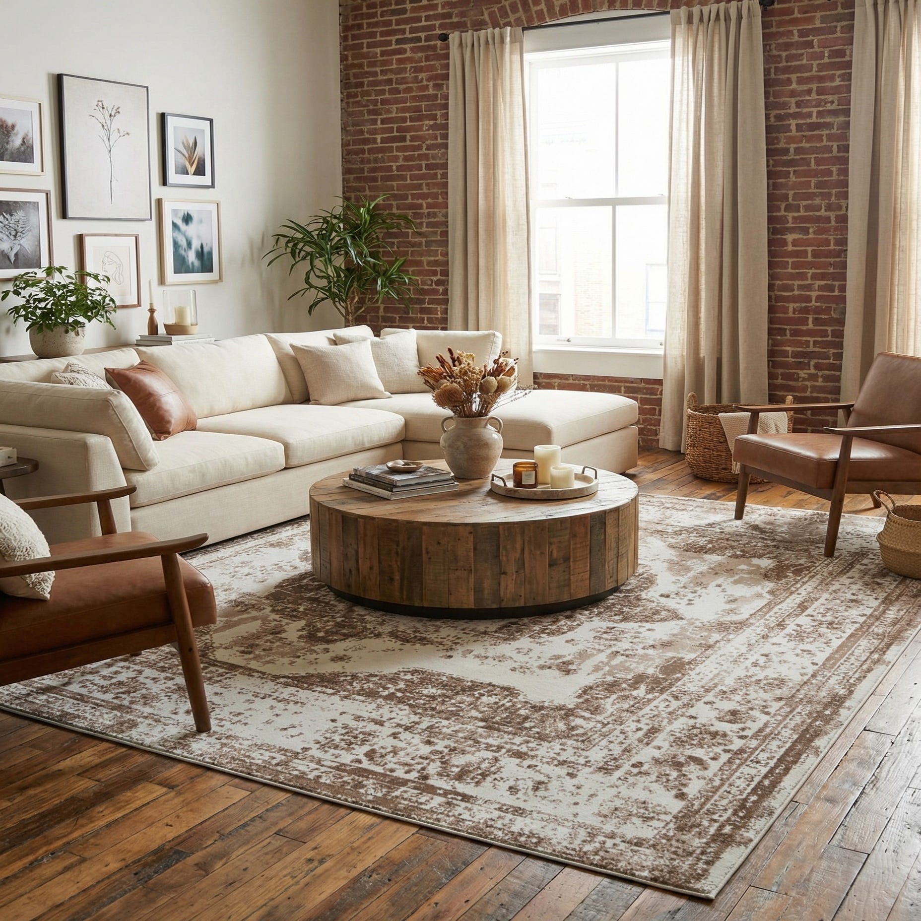 Primary color is Beige. Colors in this rug include: Beige, Brown, Ivory.