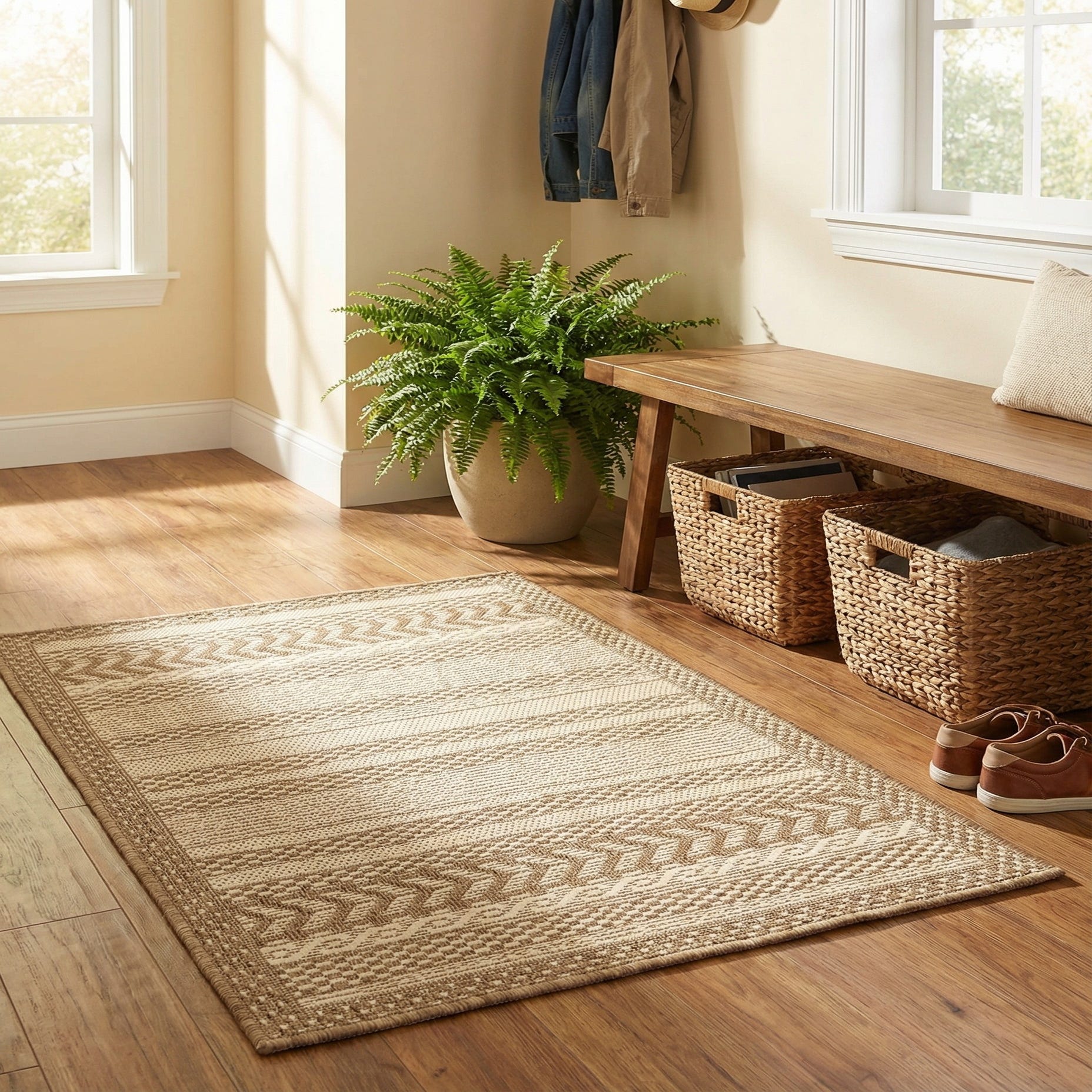 Primary color is Beige. Colors in this rug include: Beige, Brown.