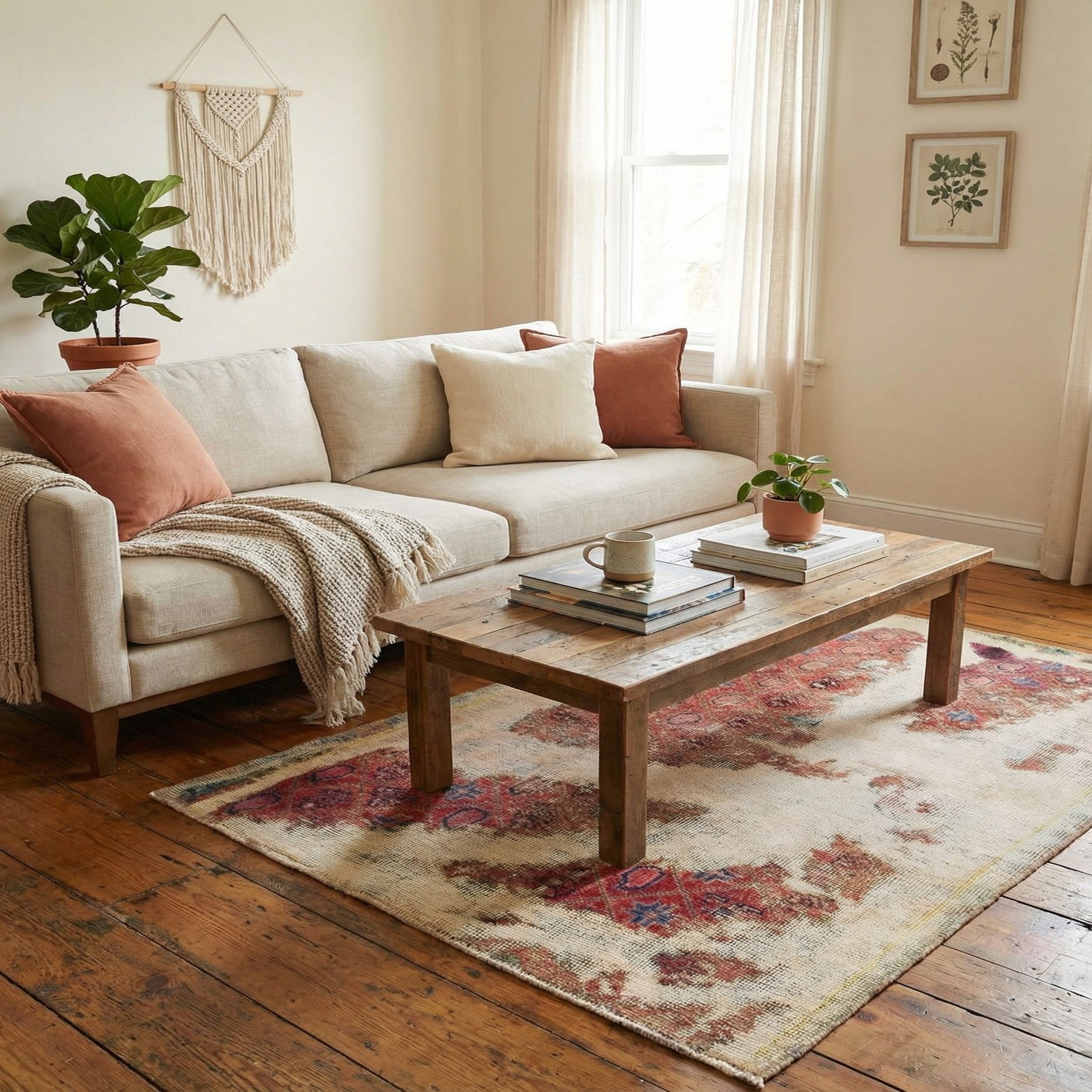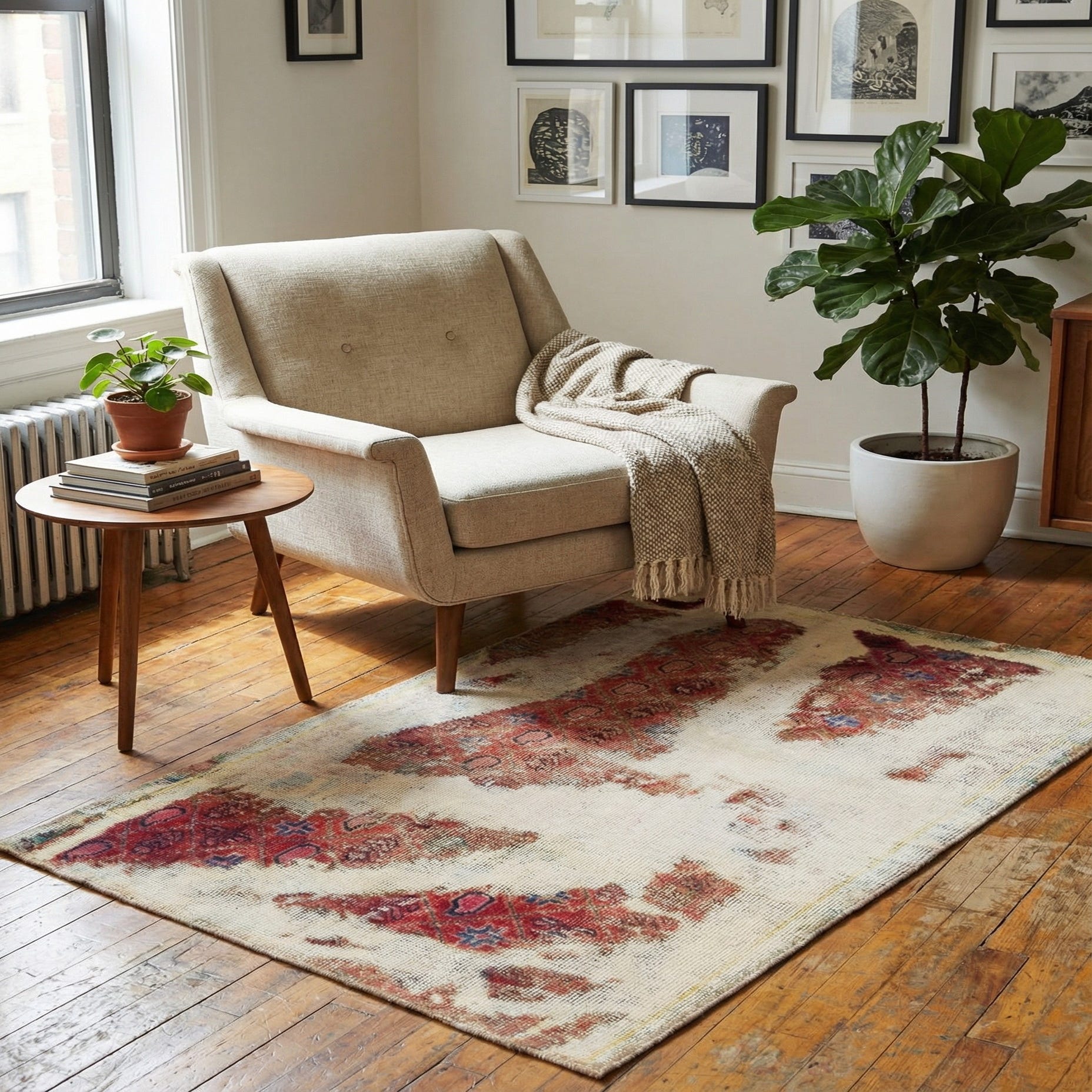 Primary color is Beige. Colors in this rug include: Beige, Brown, Red, Burgundy, Pink.