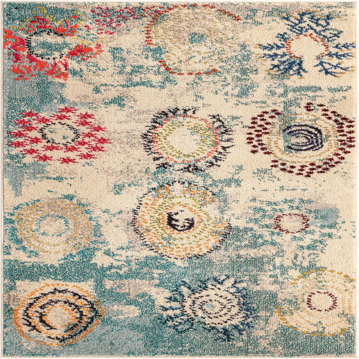 Primary color is Beige. Colors in this rug include: Beige, Green, Light Blue, Navy Blue, Orange, Red, Yellow.