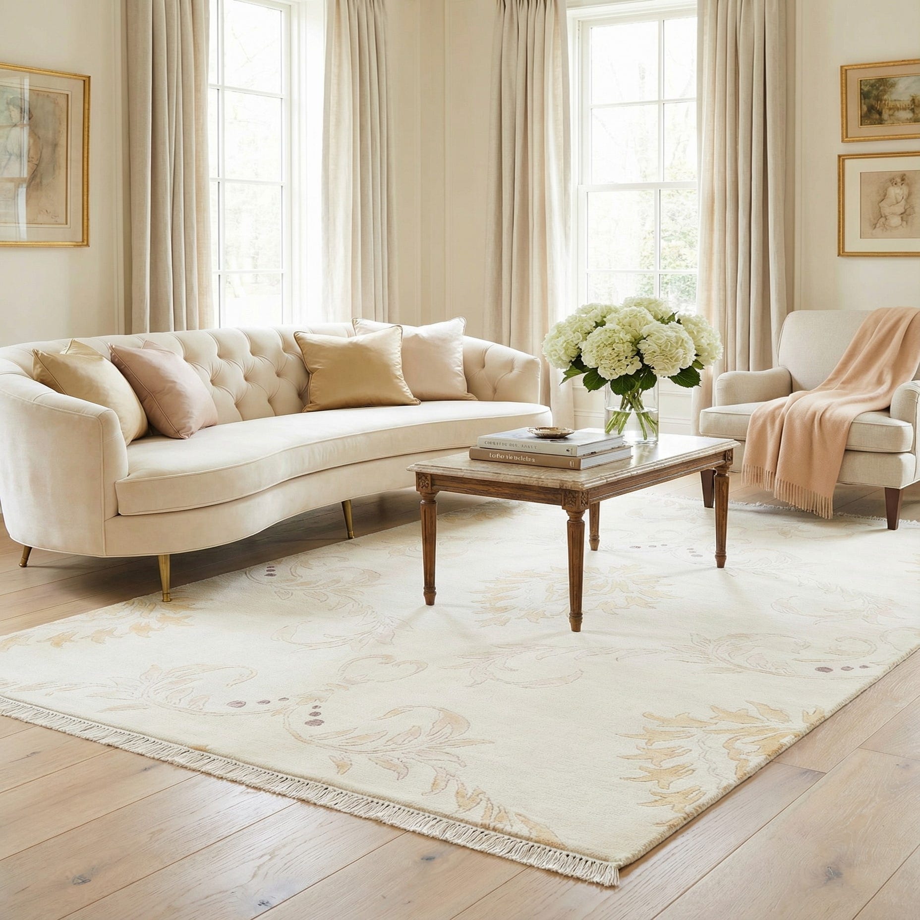 Primary color is Beige. Colors in this rug include: Beige, Gold, Light Brown, Plum Red.