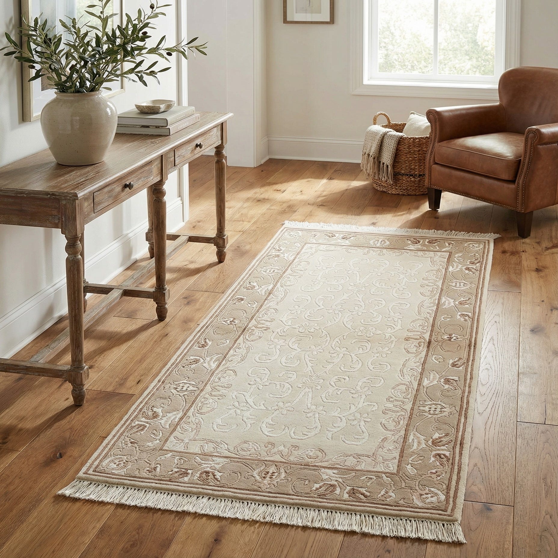 Primary color is Beige. Colors in this rug include: Beige, Brown, Ivory, Light Brown, Olive.