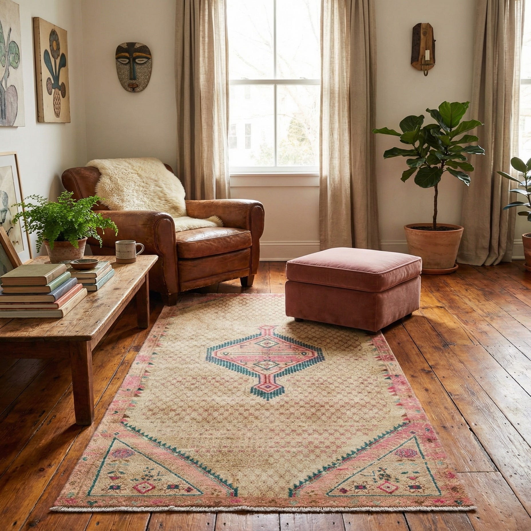 Primary color is Beige. Colors in this rug include: Beige, Cream, Pink, Blue, Green, Brown.