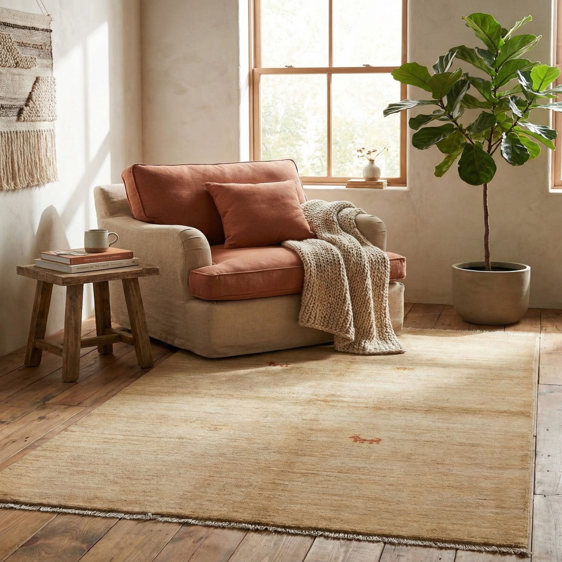 Primary color is Beige. Colors in this rug include: Beige, Terracotta.