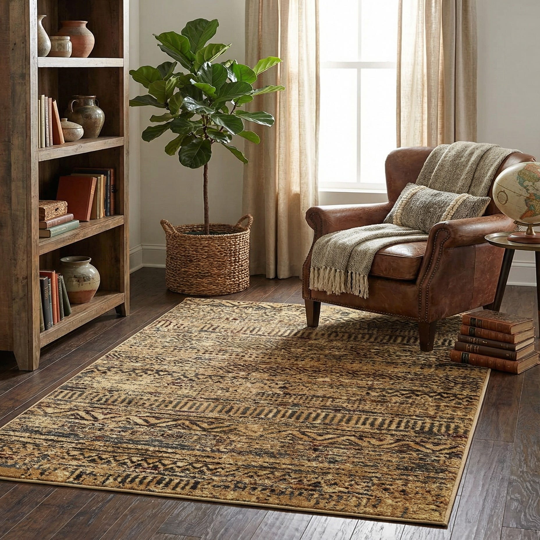 Primary color is Beige. Colors in this rug include: Beige, Black, Brown, Gray, Olive, Red.