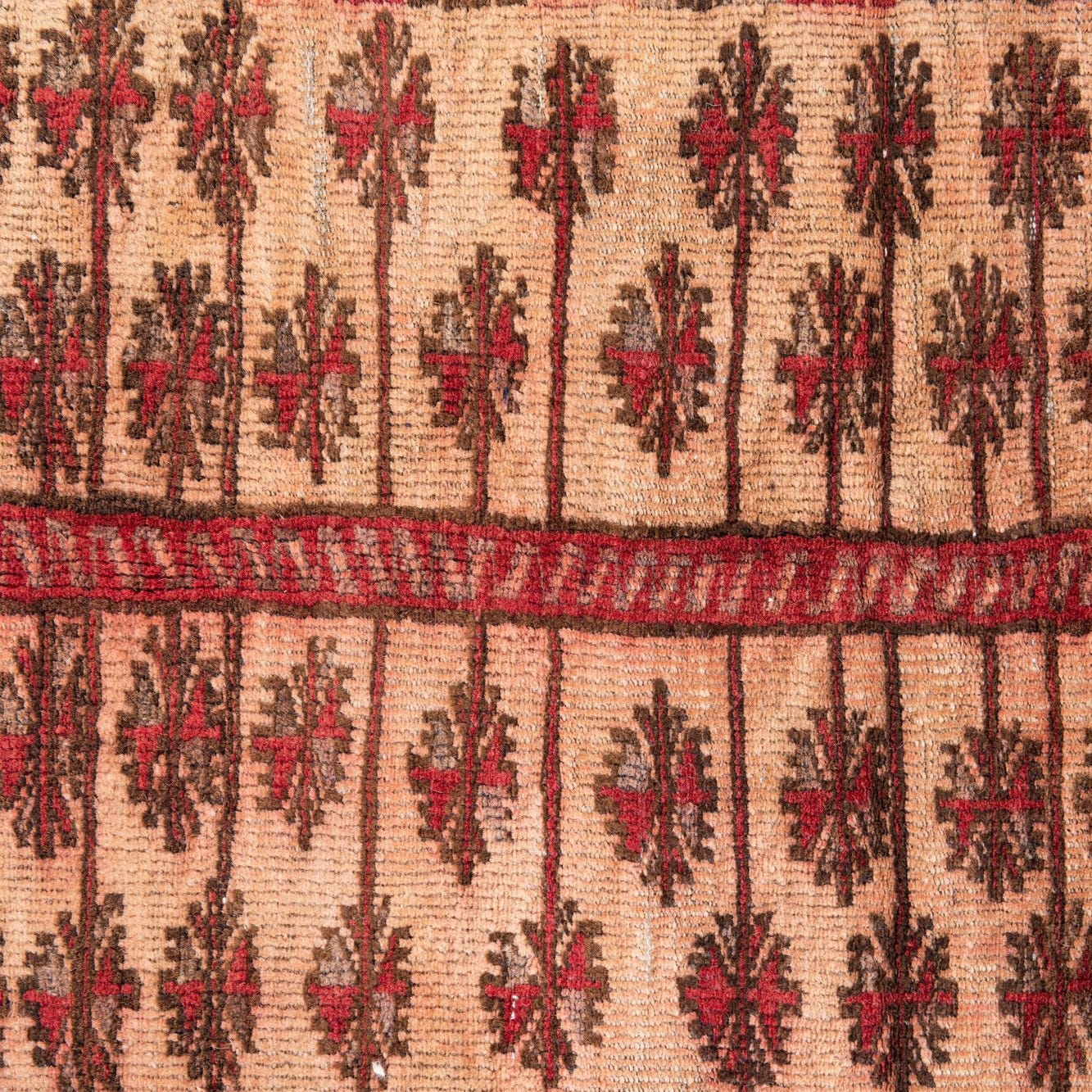 Primary color is Beige. Colors in this rug include: Beige, Brown, Red.