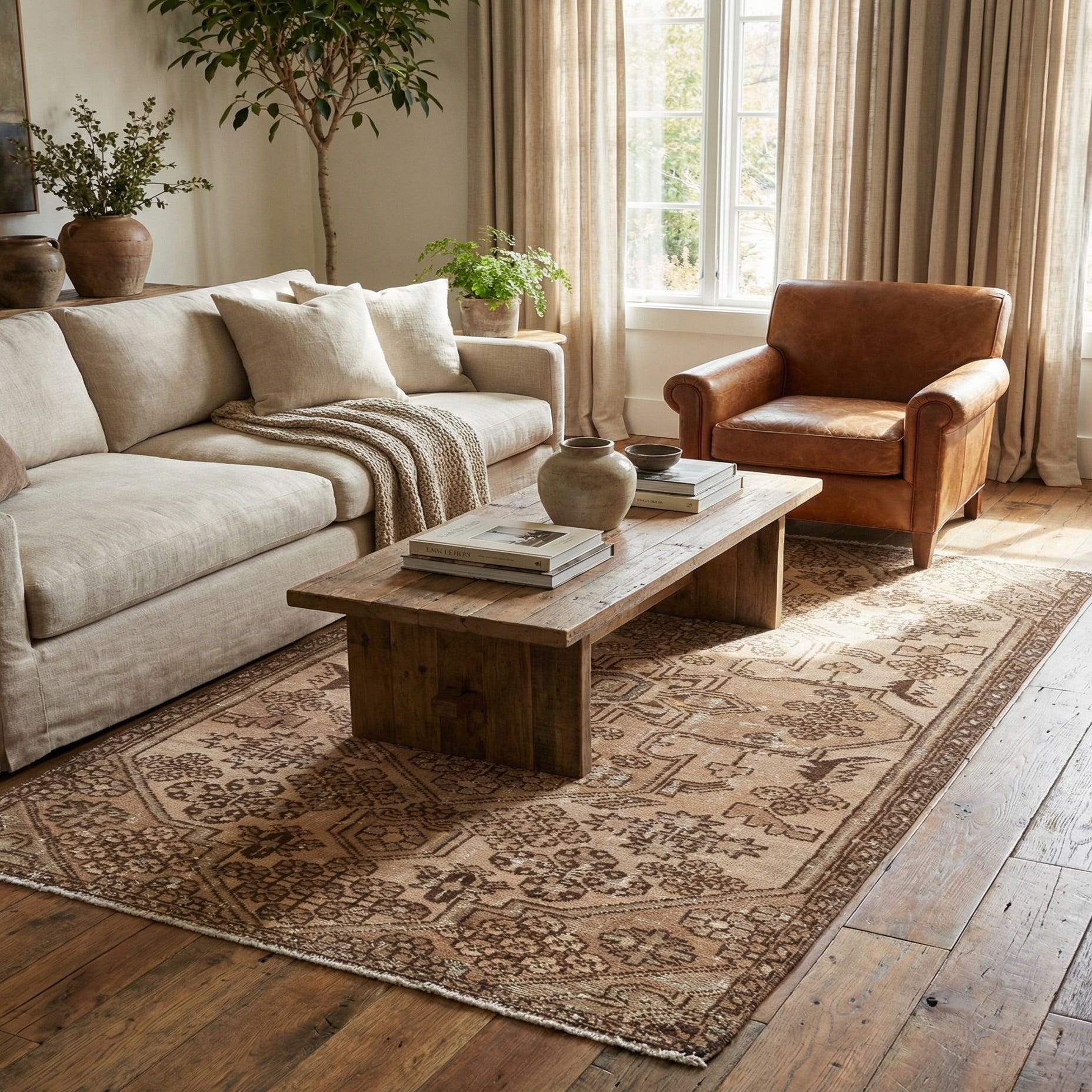 Primary color is Beige. Colors in this rug include: Beige, Brown.