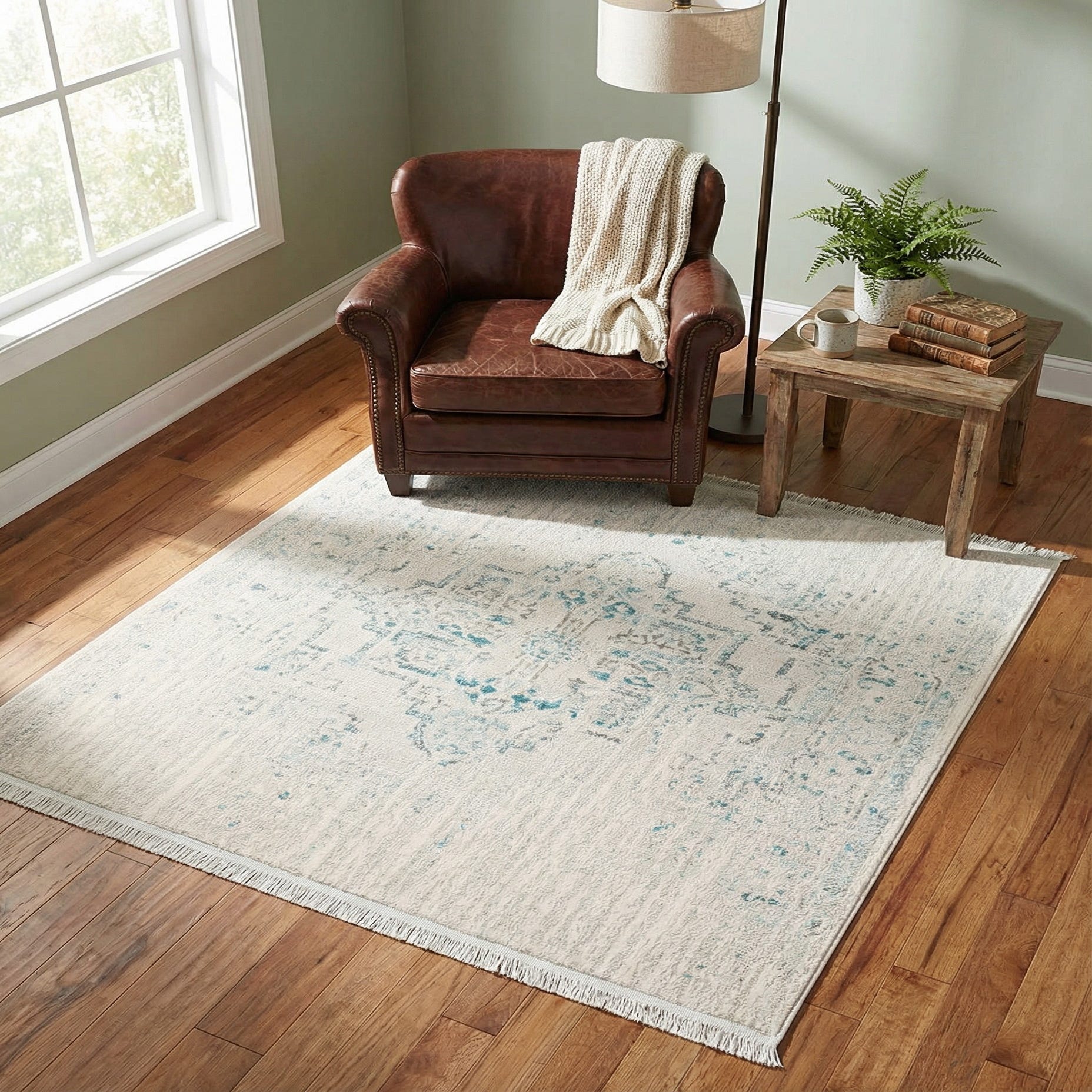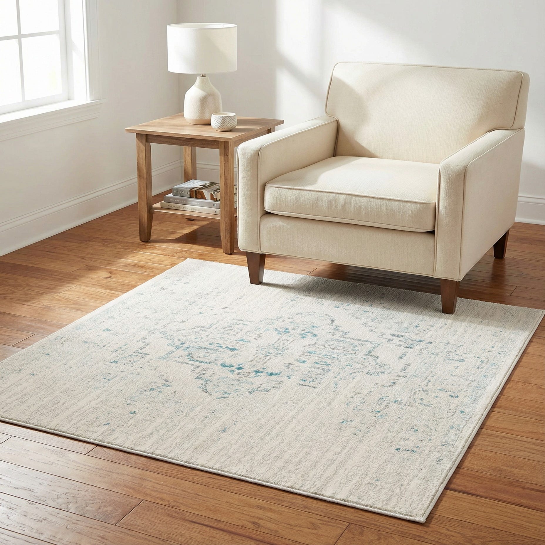 Primary color is Beige. Colors in this rug include: Beige, Gray, Ivory, Light Blue.