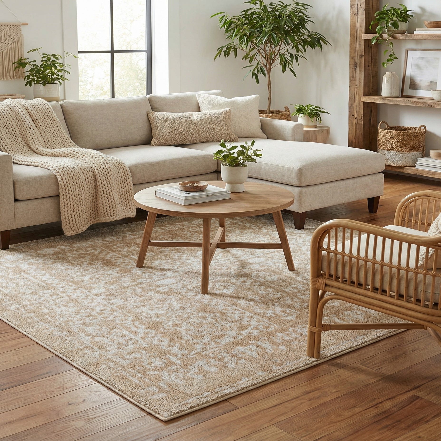 Primary color is Beige. Colors in this rug include: Beige, Ivory.
