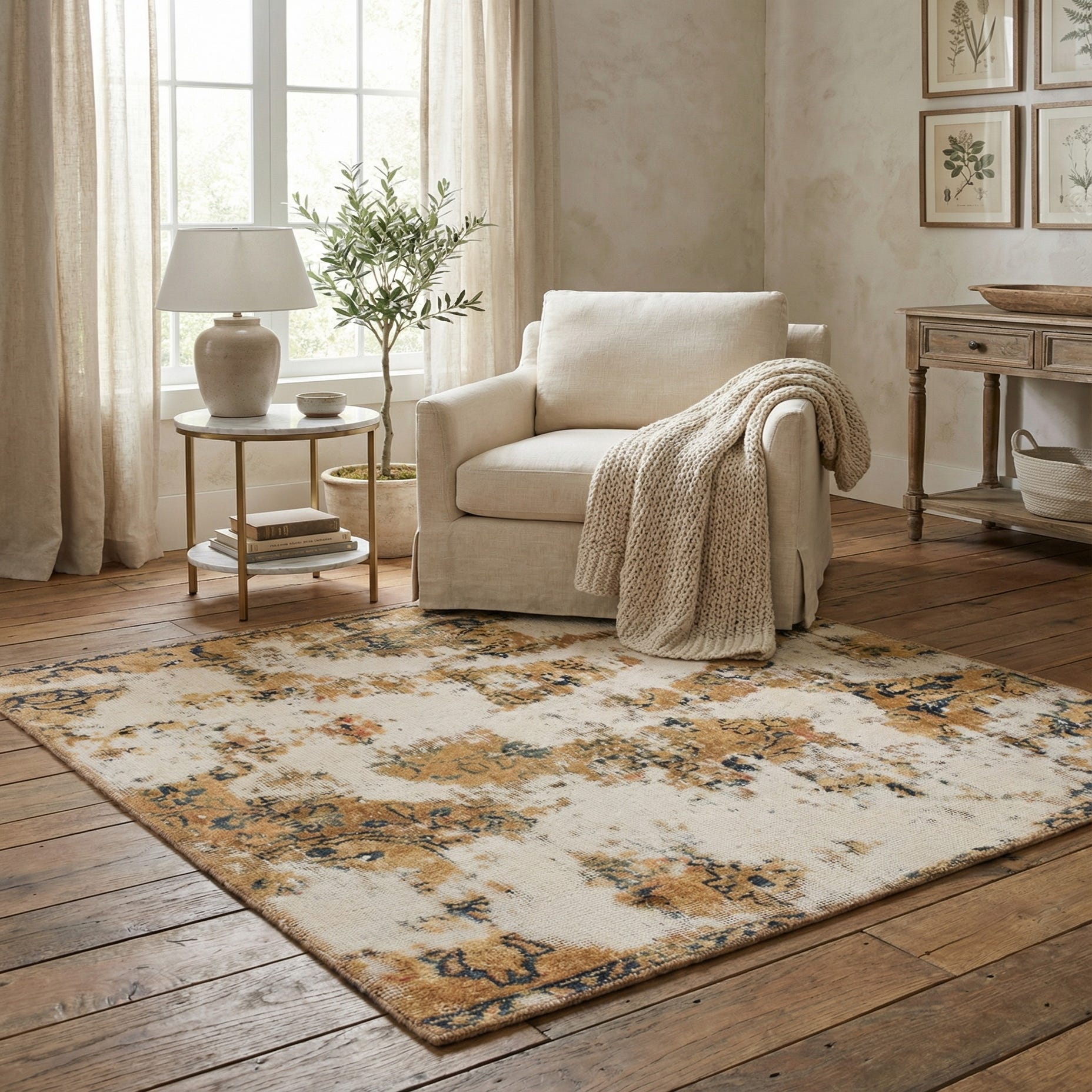 Primary color is Beige. Colors in this rug include: Beige, Brown, Light Brown, Navy Blue, Olive, Puce.