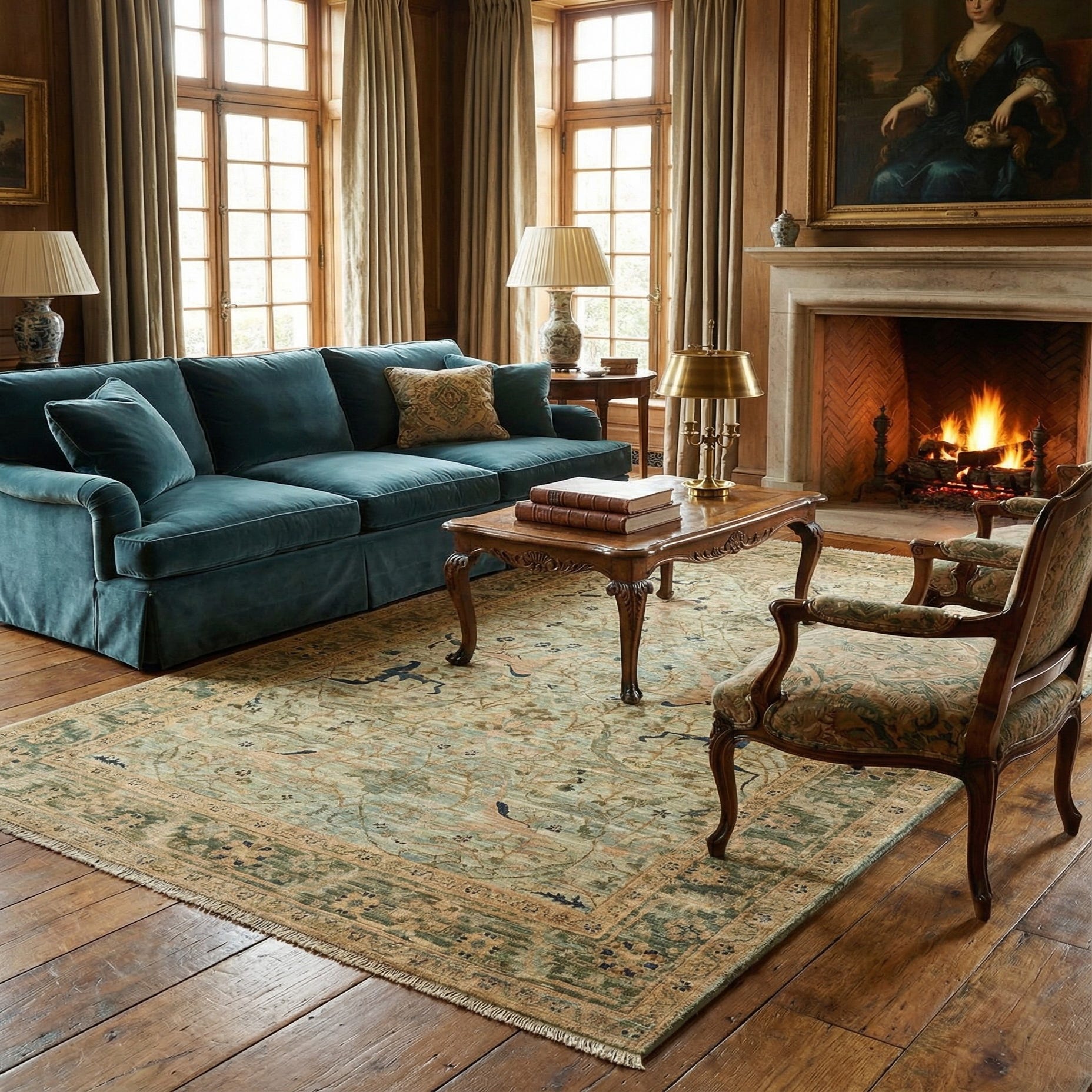 Primary color is Beige. Colors in this rug include: Beige, Green, Light Blue.