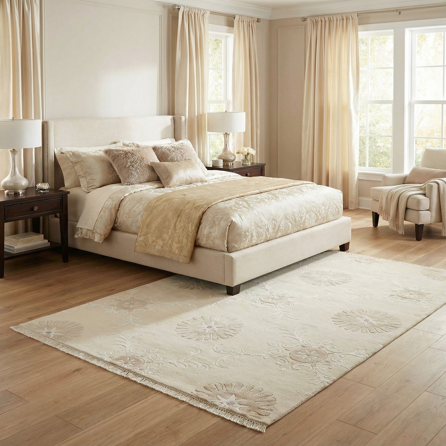 Primary color is Beige. Colors in this rug include: Beige, Ivory, Plum Red, Tan.