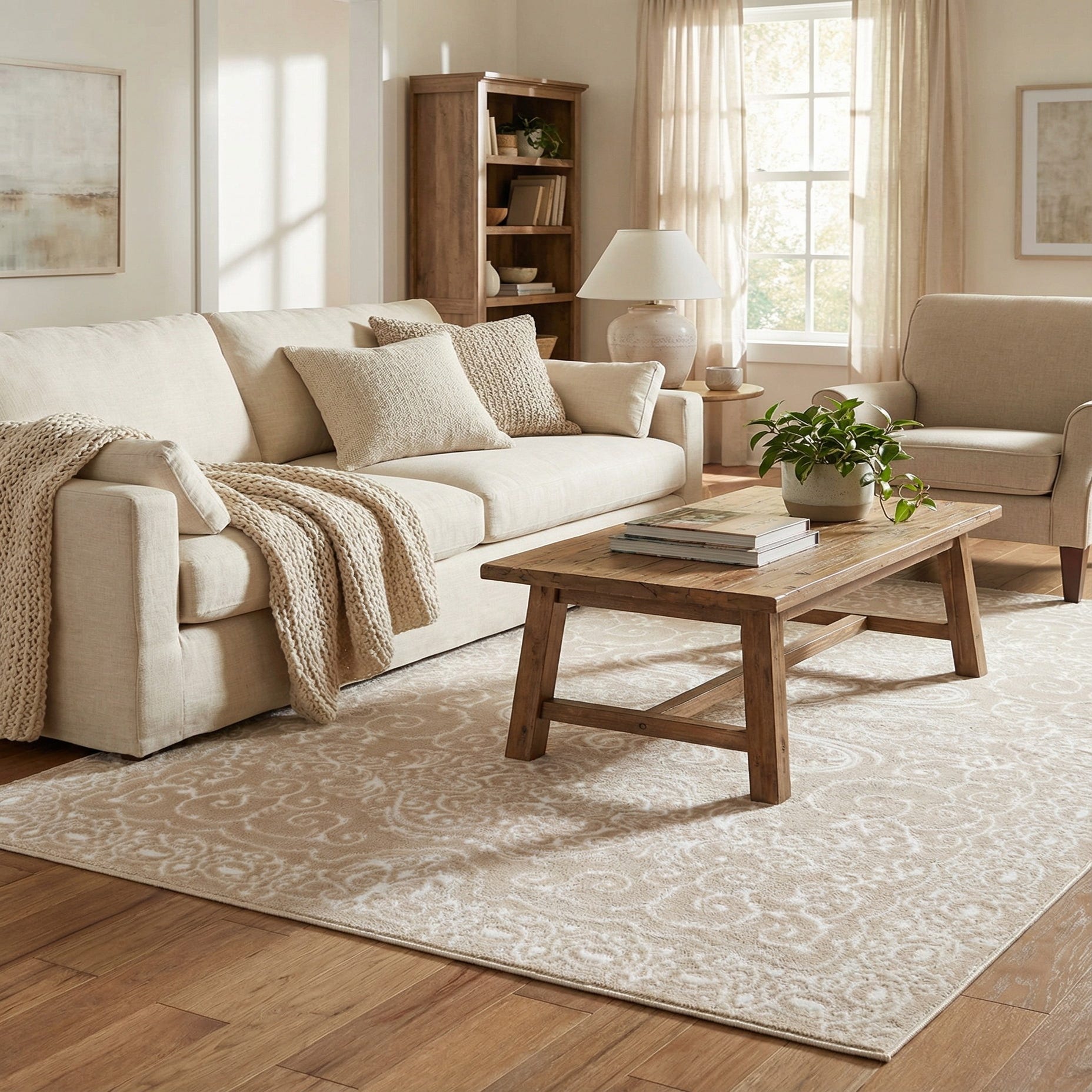 Primary color is Beige. Colors in this rug include: Beige, Ivory.