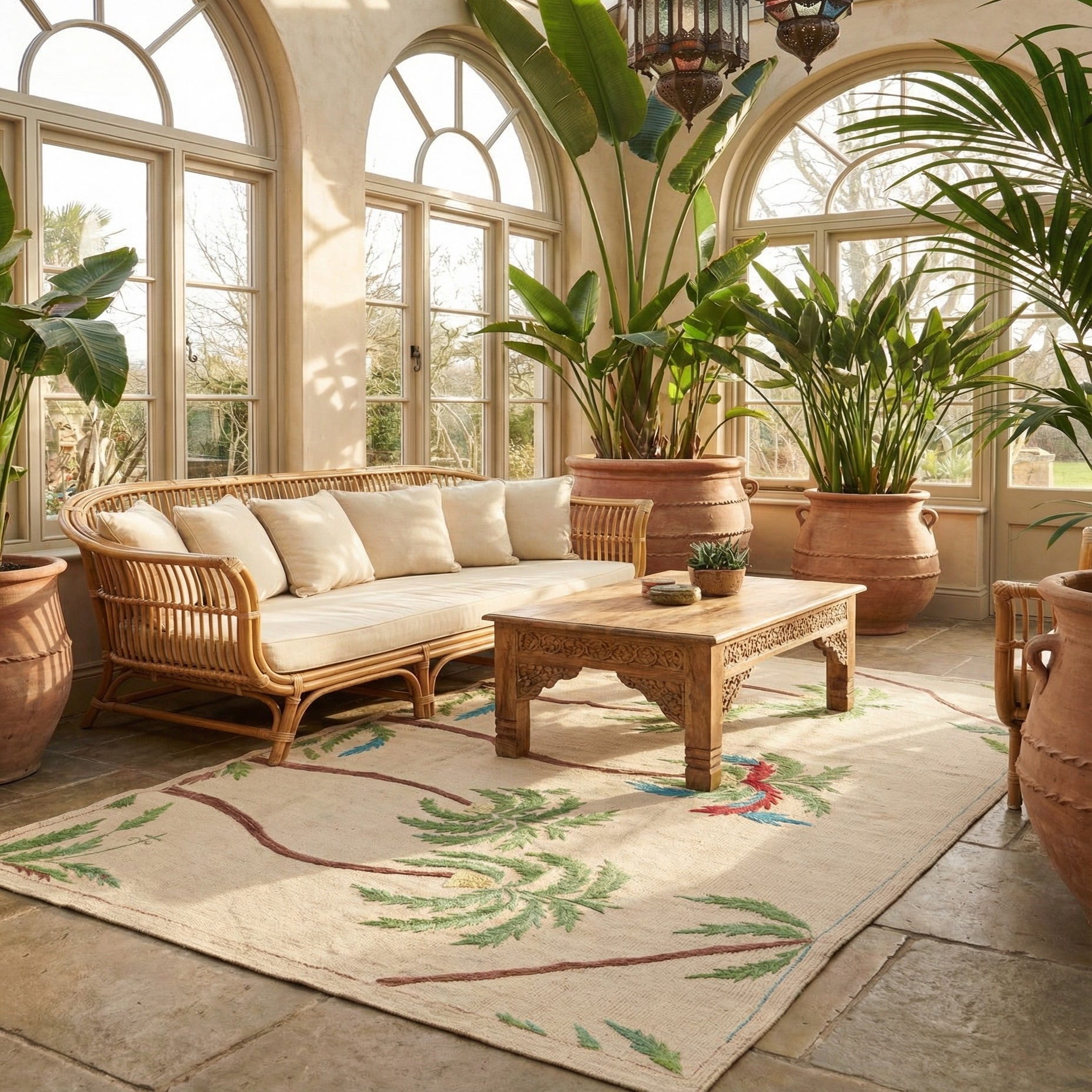 Primary color is Beige. Colors in this rug include: Beige, Blue, Burgundy, Green, Teal.
