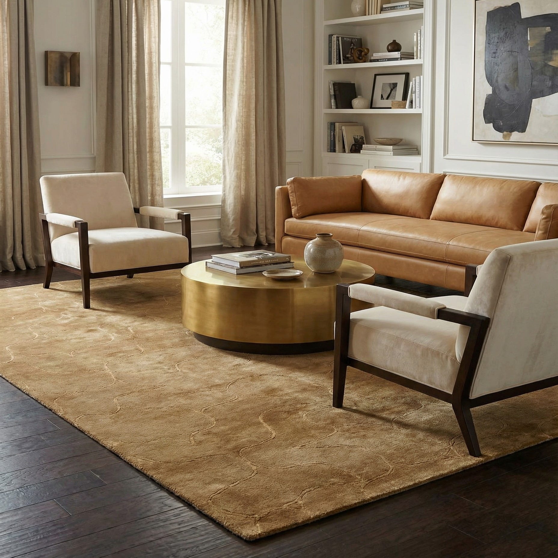 Primary color is Beige. Colors in this rug include: Beige, Brown, Gold.