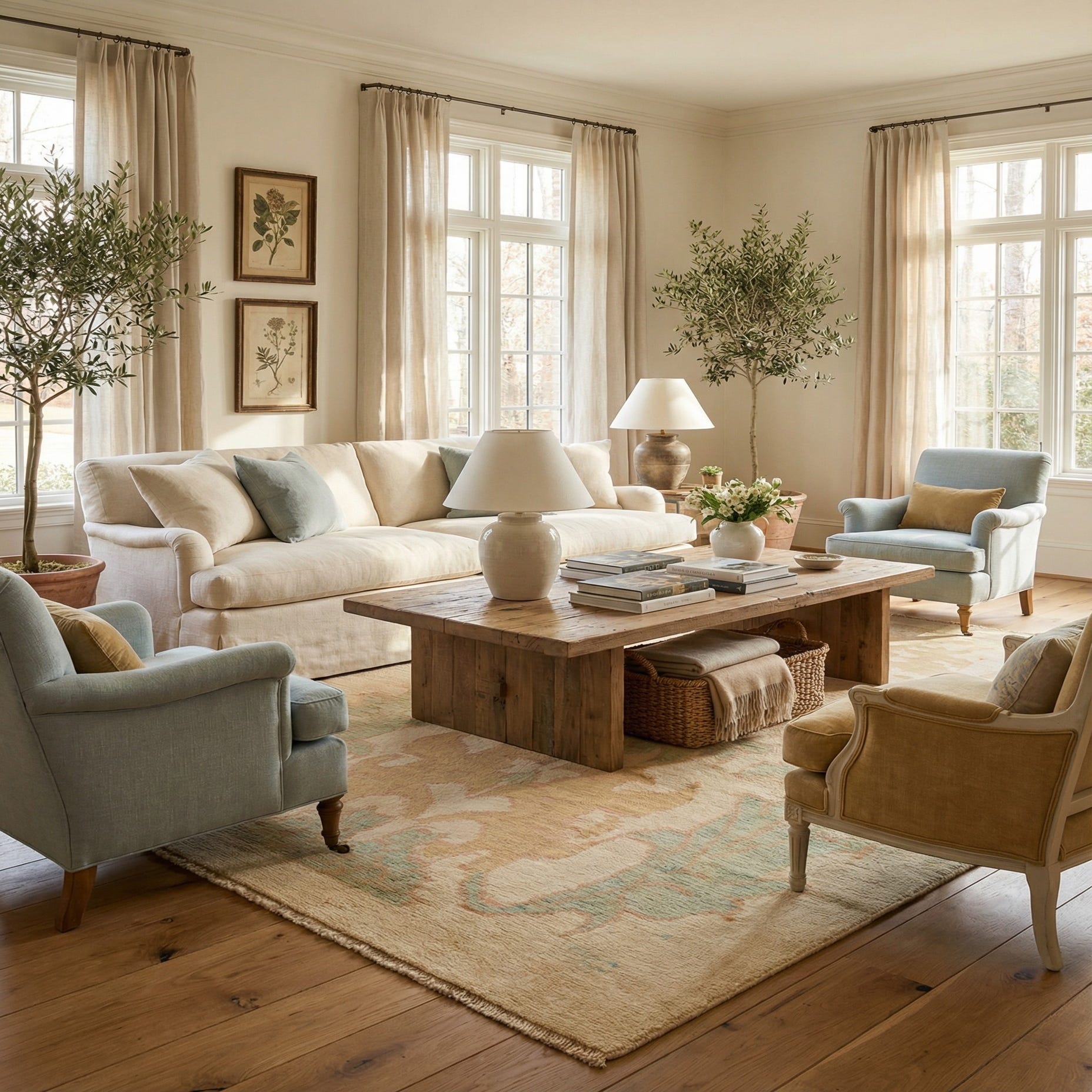 Primary color is Beige. Colors in this rug include: Beige, Gold, Light Blue, Olive, Peach.