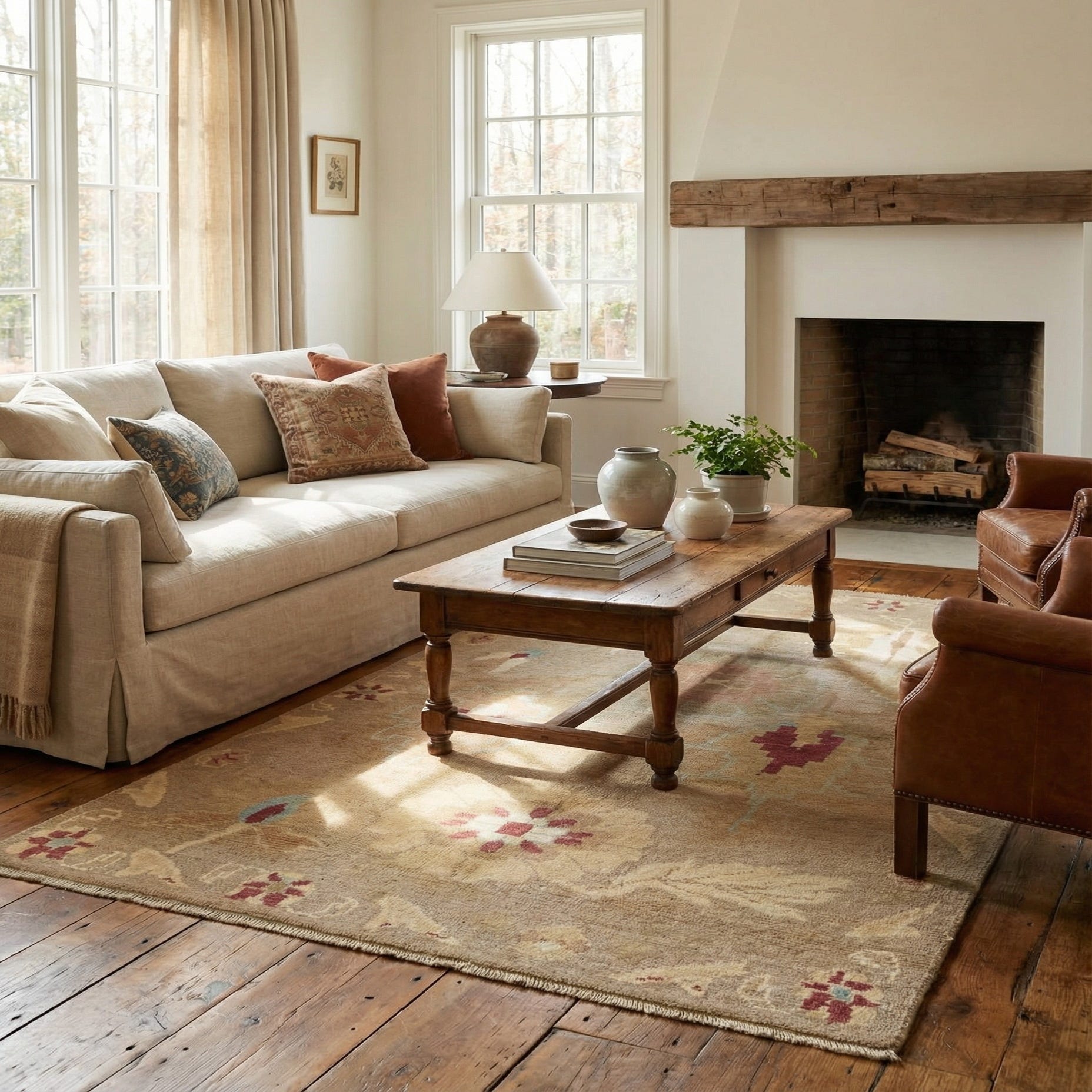 Primary color is Beige. Colors in this rug include: Beige, Blue, Cream, Red, Peach.