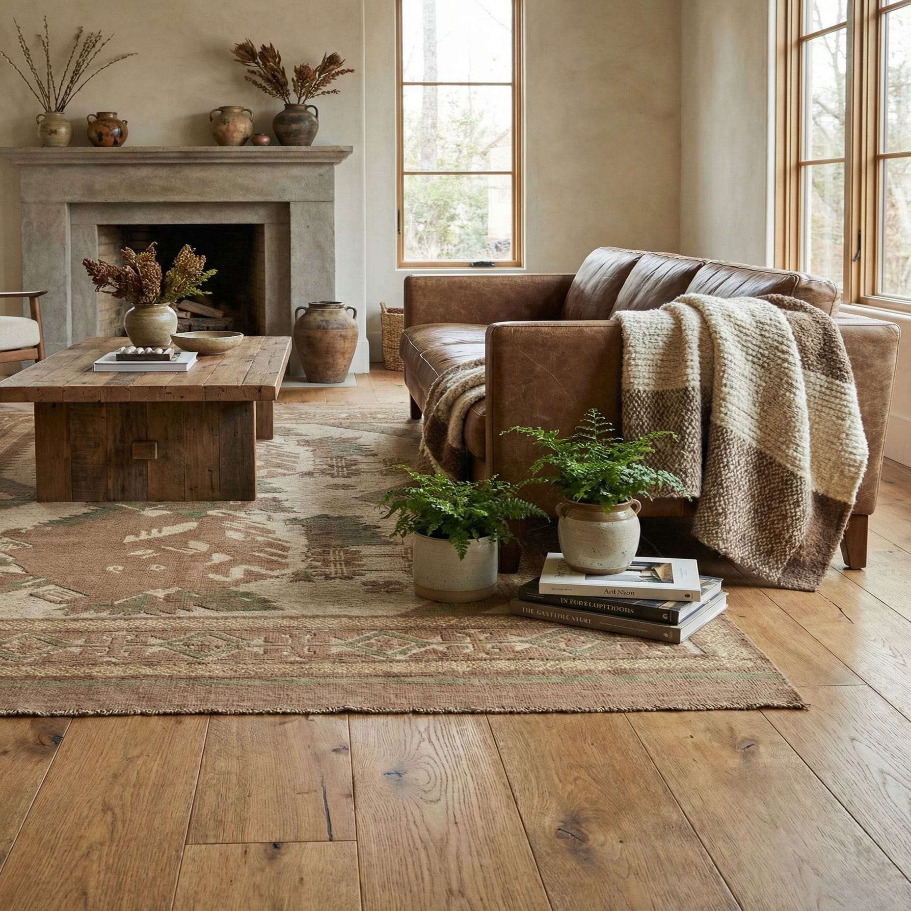 Primary color is Beige. Colors in this rug include: Beige, Brown, Light Green.