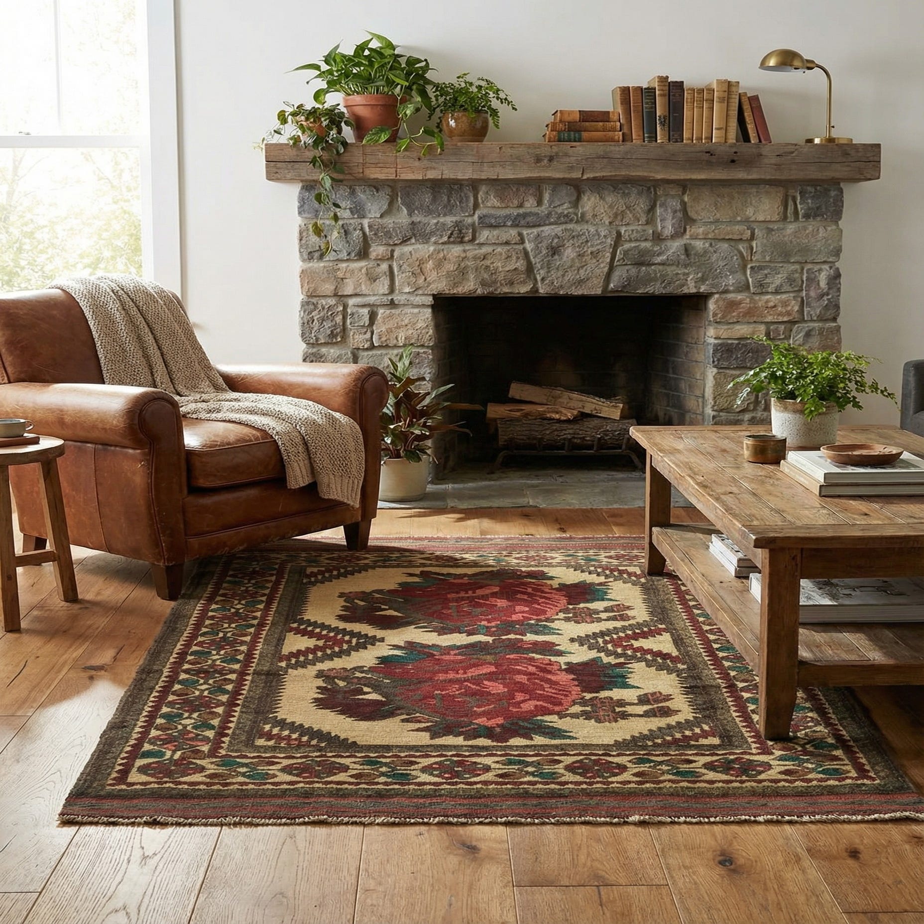 Primary color is Beige. Colors in this rug include: Beige, Brown, Green, Navy Blue, Red, Pink, Olive.