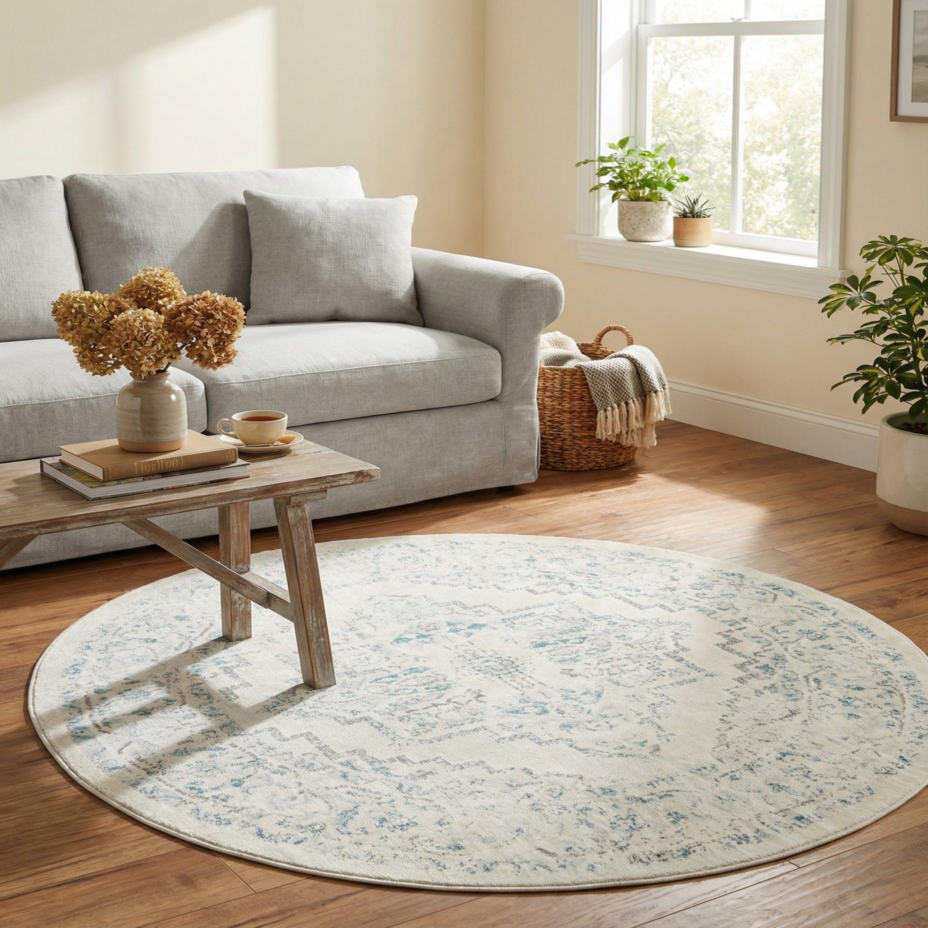 Primary color is Beige. Colors in this rug include: Beige, Gray, Ivory, Light Blue.
