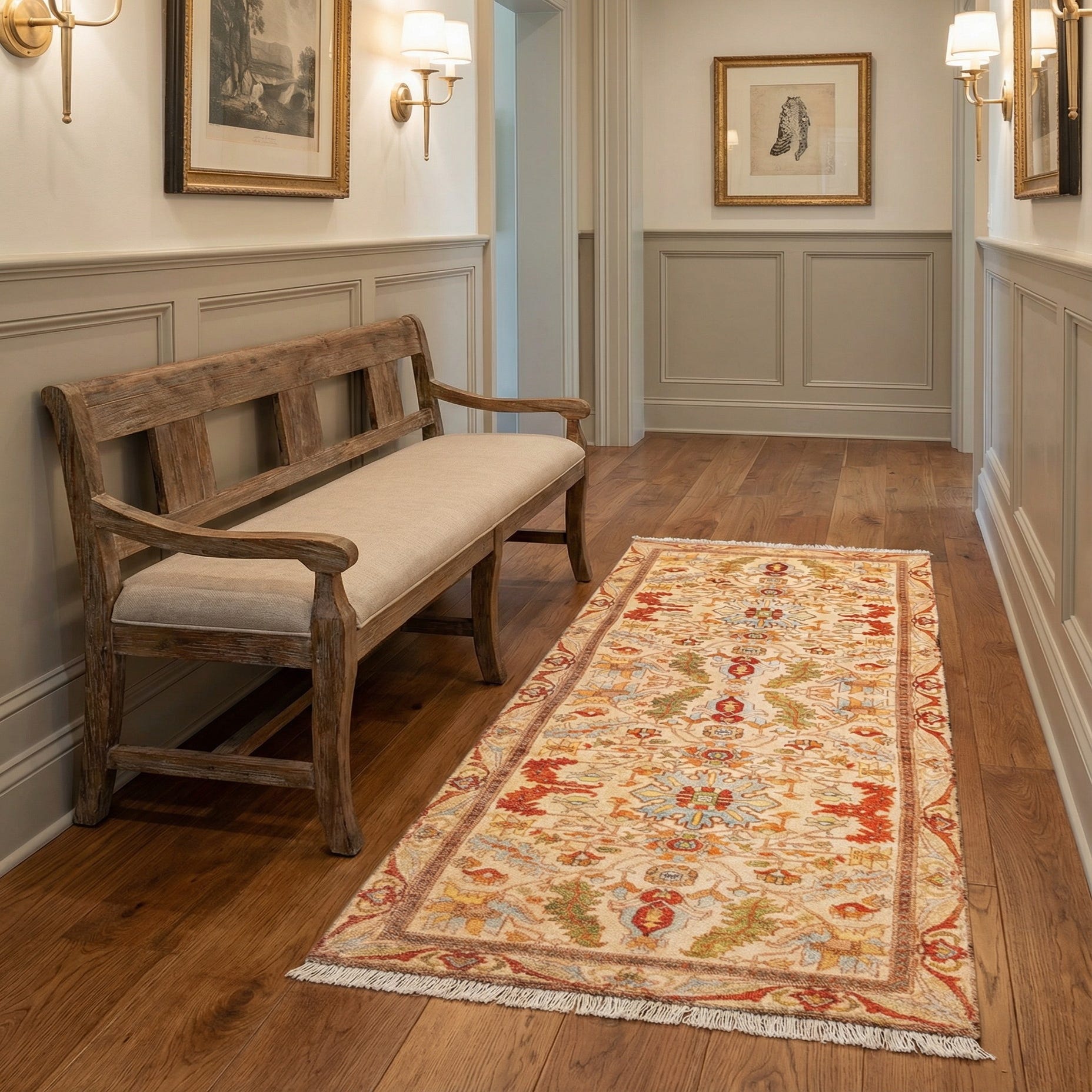 Primary color is Beige. Colors in this rug include: Beige, Black, Brown, Navy Blue, Red, Yellow, Olive, Orange.