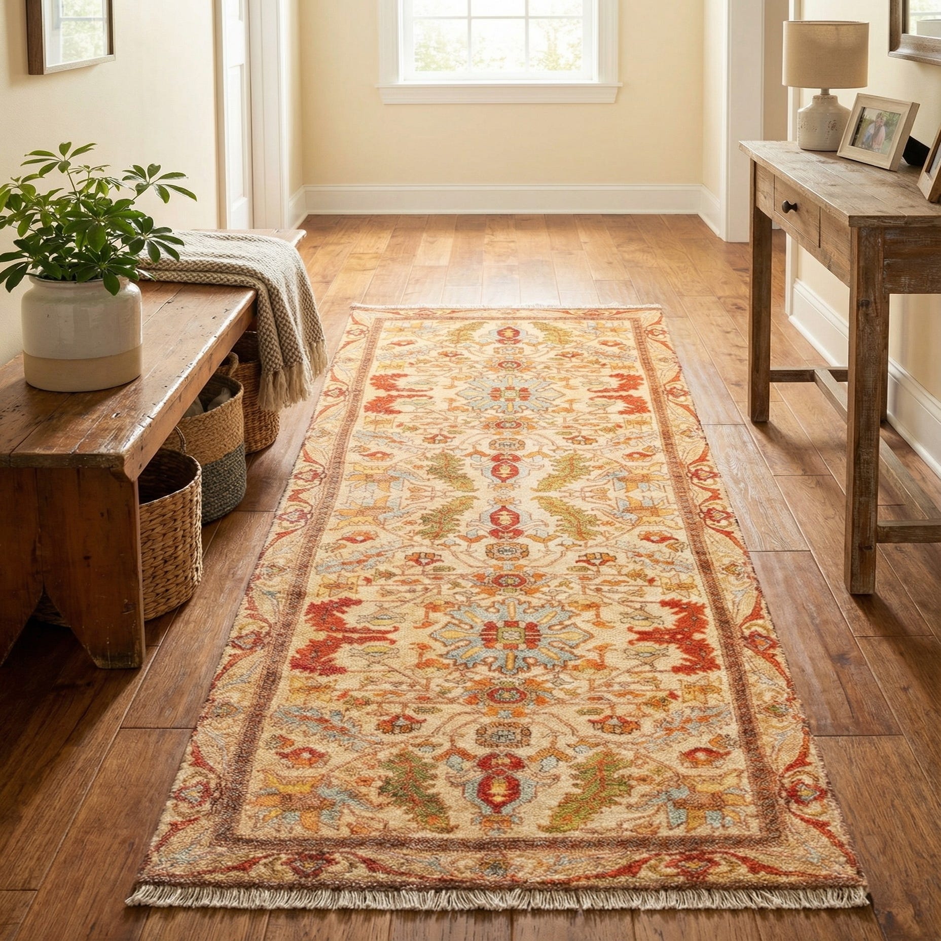 Primary color is Beige. Colors in this rug include: Beige, Black, Brown, Navy Blue, Red, Yellow, Olive, Orange.