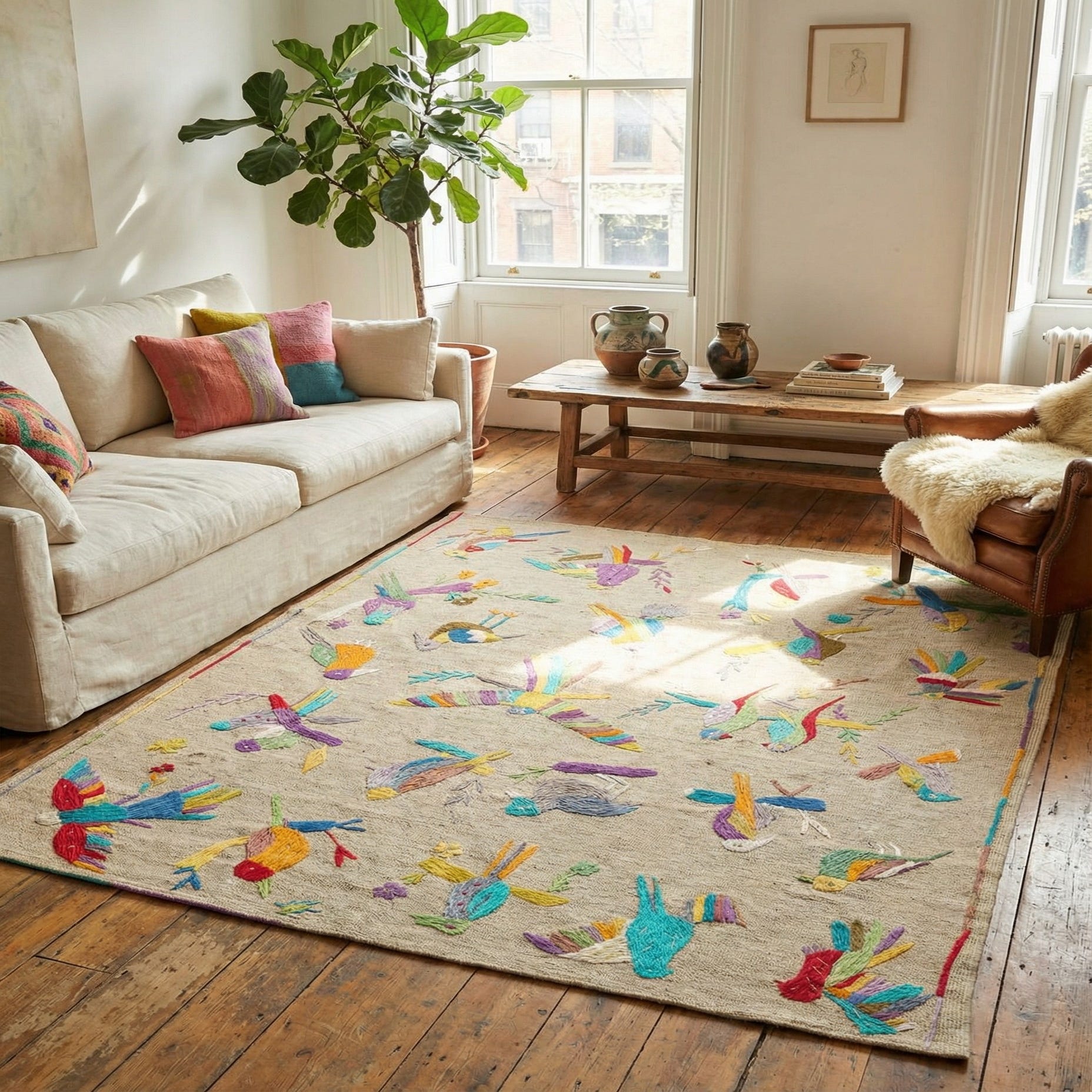 Primary color is Beige. Colors in this rug include: Beige, Blue, Brown, Olive, Red, Orange, Violet, Yellow, Gold.