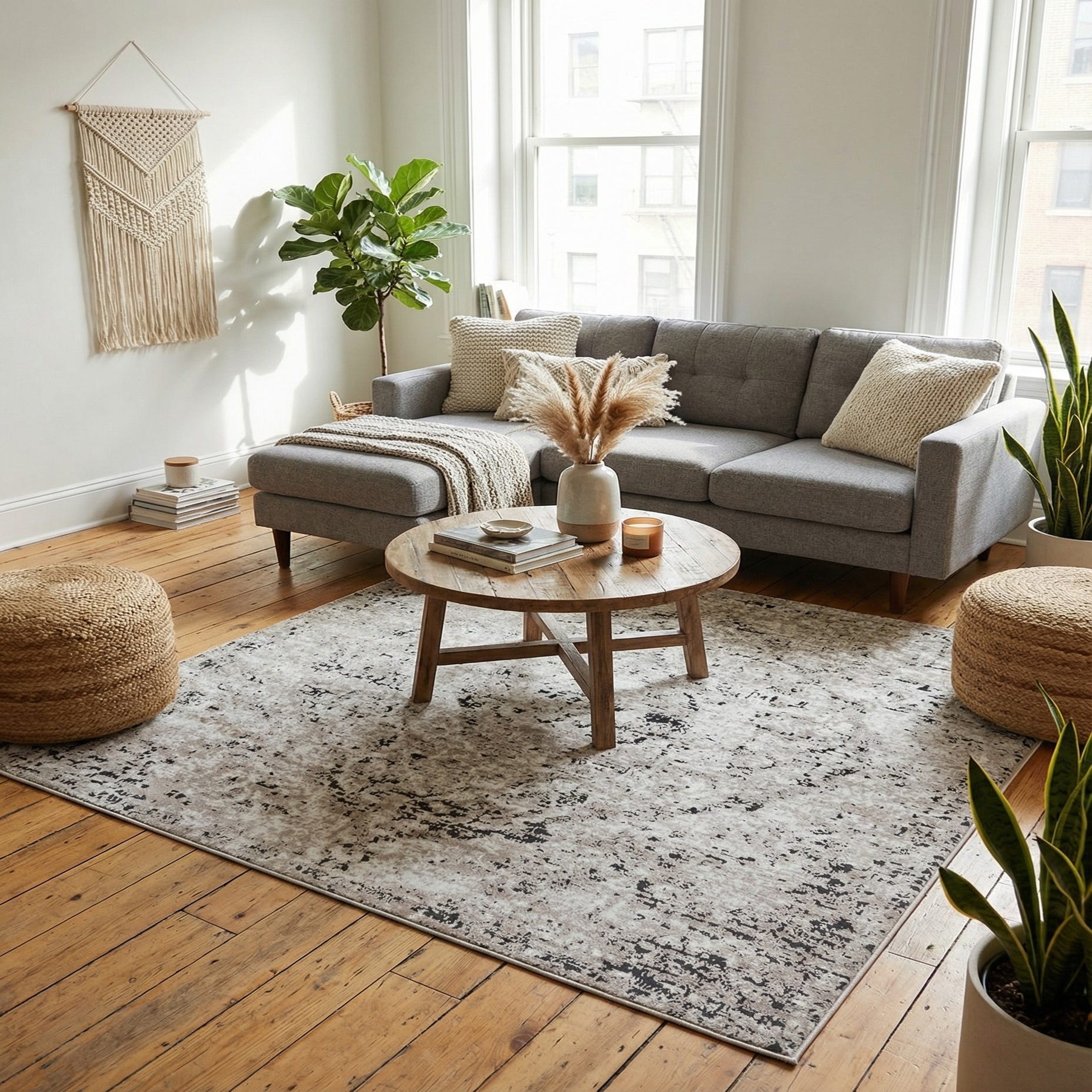 Primary color is Beige. Colors in this rug include: Beige, Gray, Ivory, Light Brown.