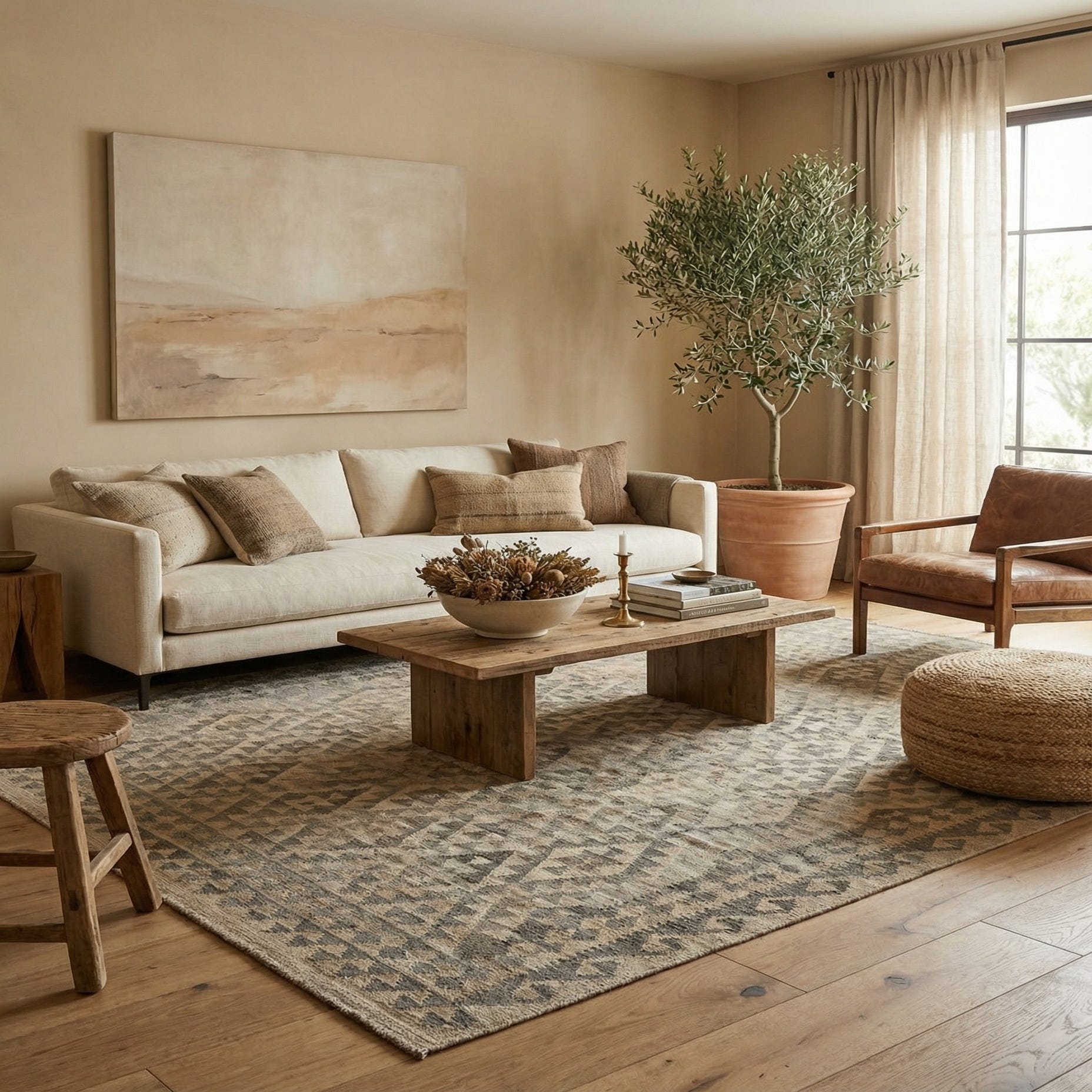 Primary color is Beige. Colors in this rug include: Beige, Gray.