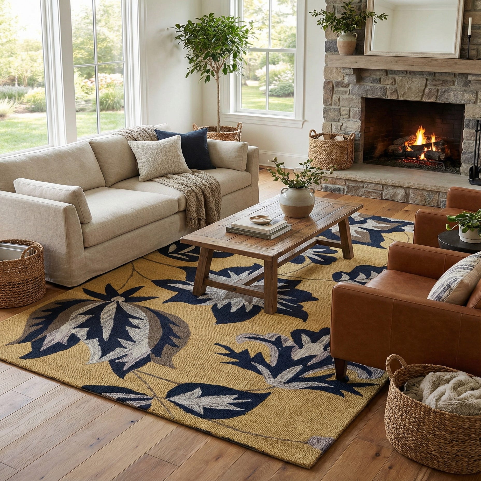 Primary color is Beige. Colors in this rug include: Beige, Gray, Ivory, Navy Blue, Brown.