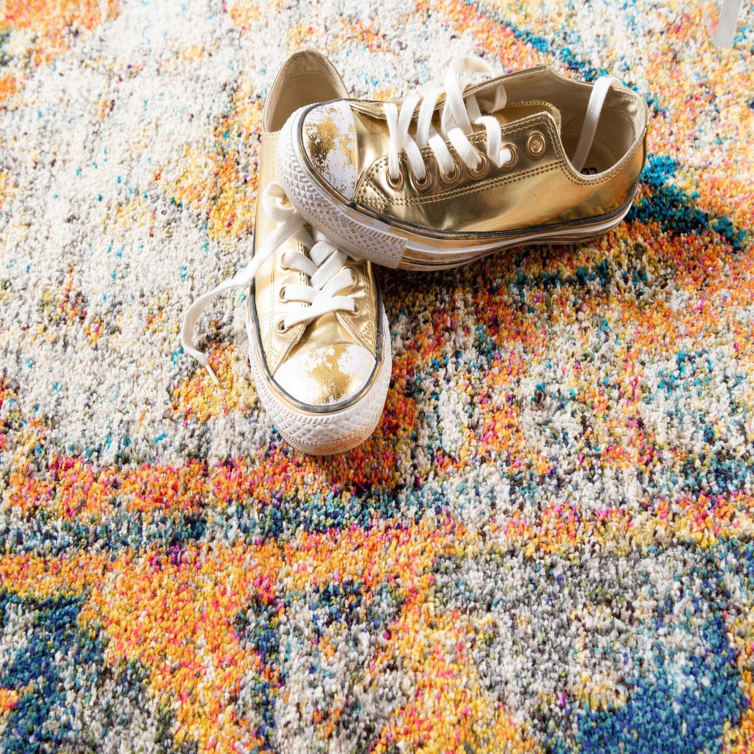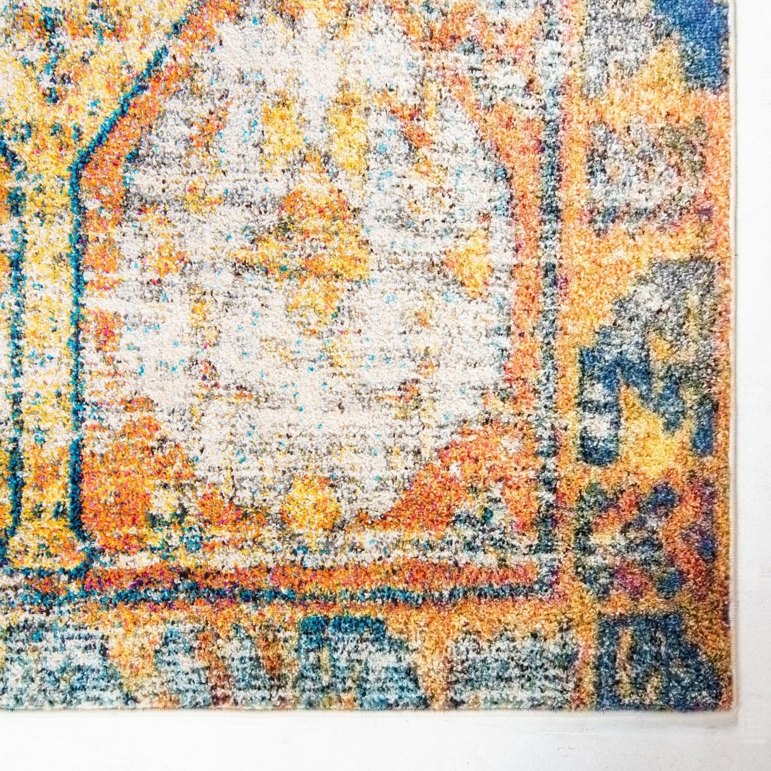 Primary color is Beige. Colors in this rug include: Beige, Blue, Gold, Green, Navy Blue, Orange, Red.