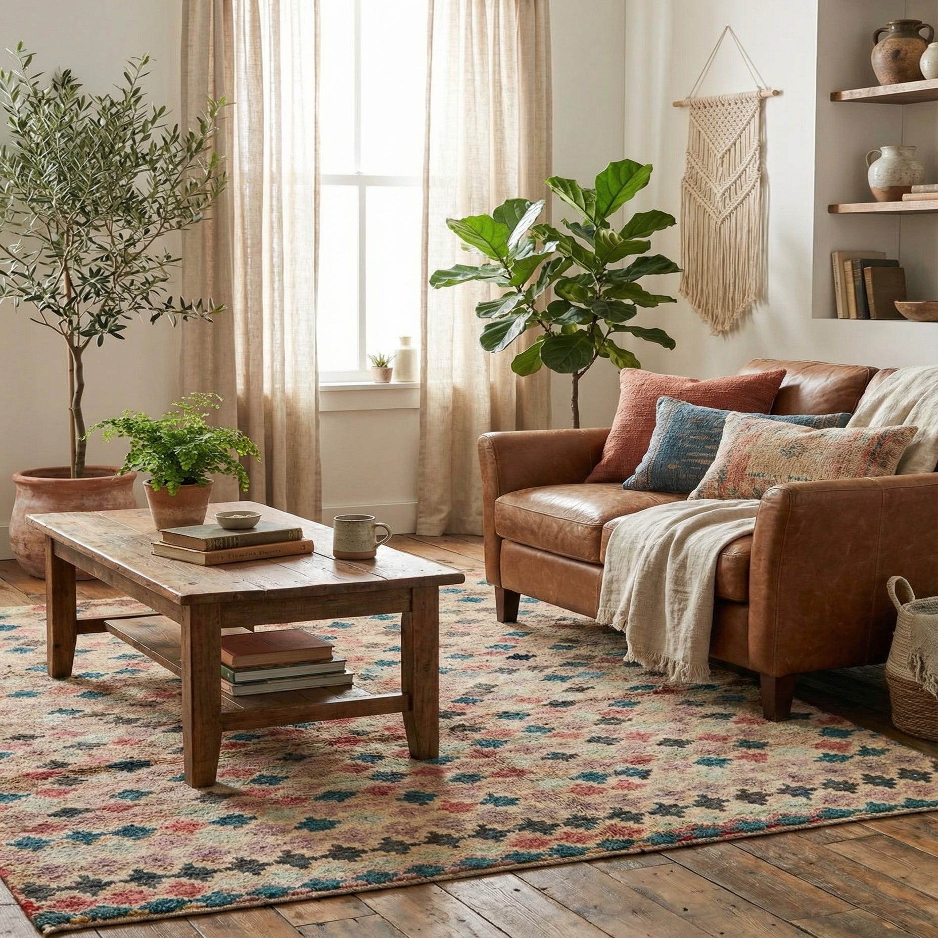 Primary color is Beige. Colors in this rug include: Beige, Brown, Light Blue, Navy Blue, Rust Red.