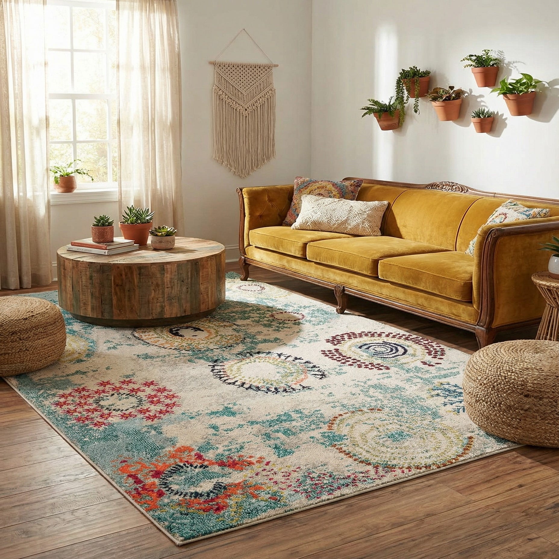 Primary color is Beige. Colors in this rug include: Beige, Green, Light Blue, Navy Blue, Orange, Red, Yellow.