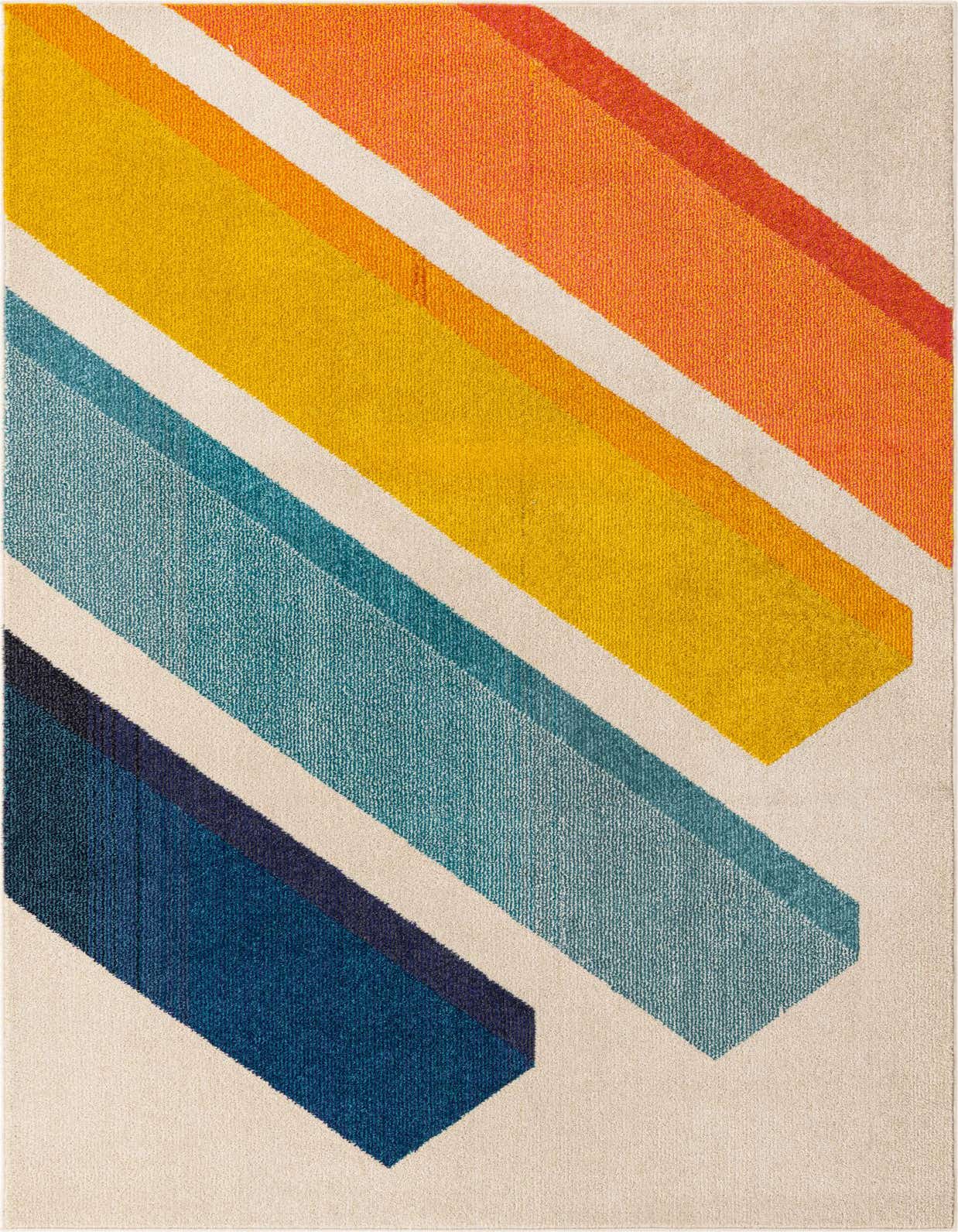 Primary color is Beige. Colors in this rug include: Beige, Black, Blue, Gold, Navy Blue, Orange.