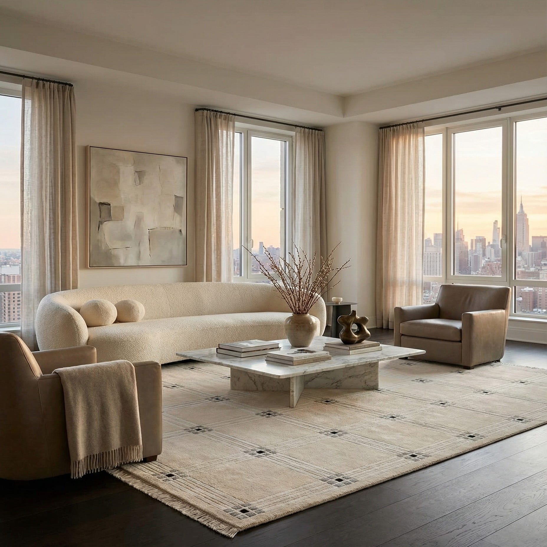 Primary color is Beige. Colors in this rug include: Beige, Black, Gray.