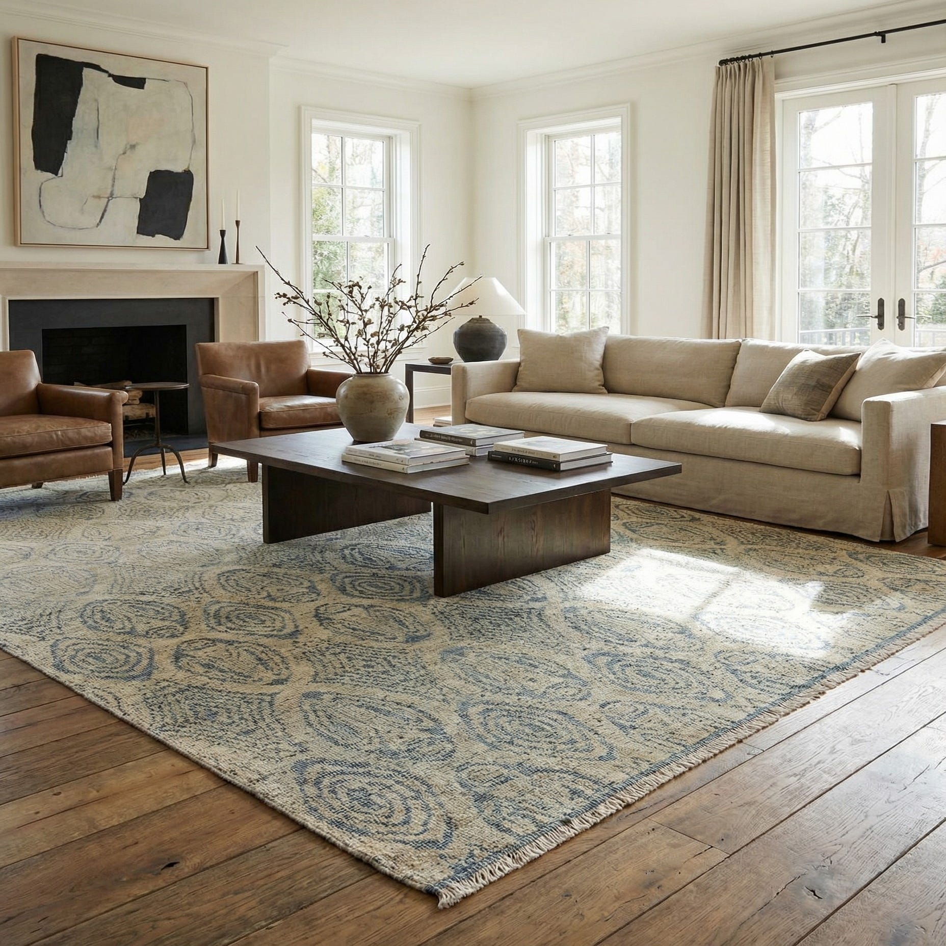Primary color is Beige. Colors in this rug include: Beige, Blue, Ivory.