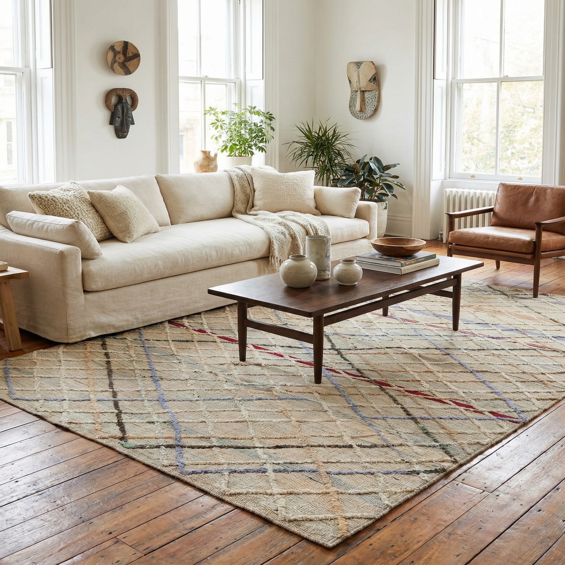 Primary color is Beige. Colors in this rug include: Beige, Black, Blue, Brown, Gray, Red.