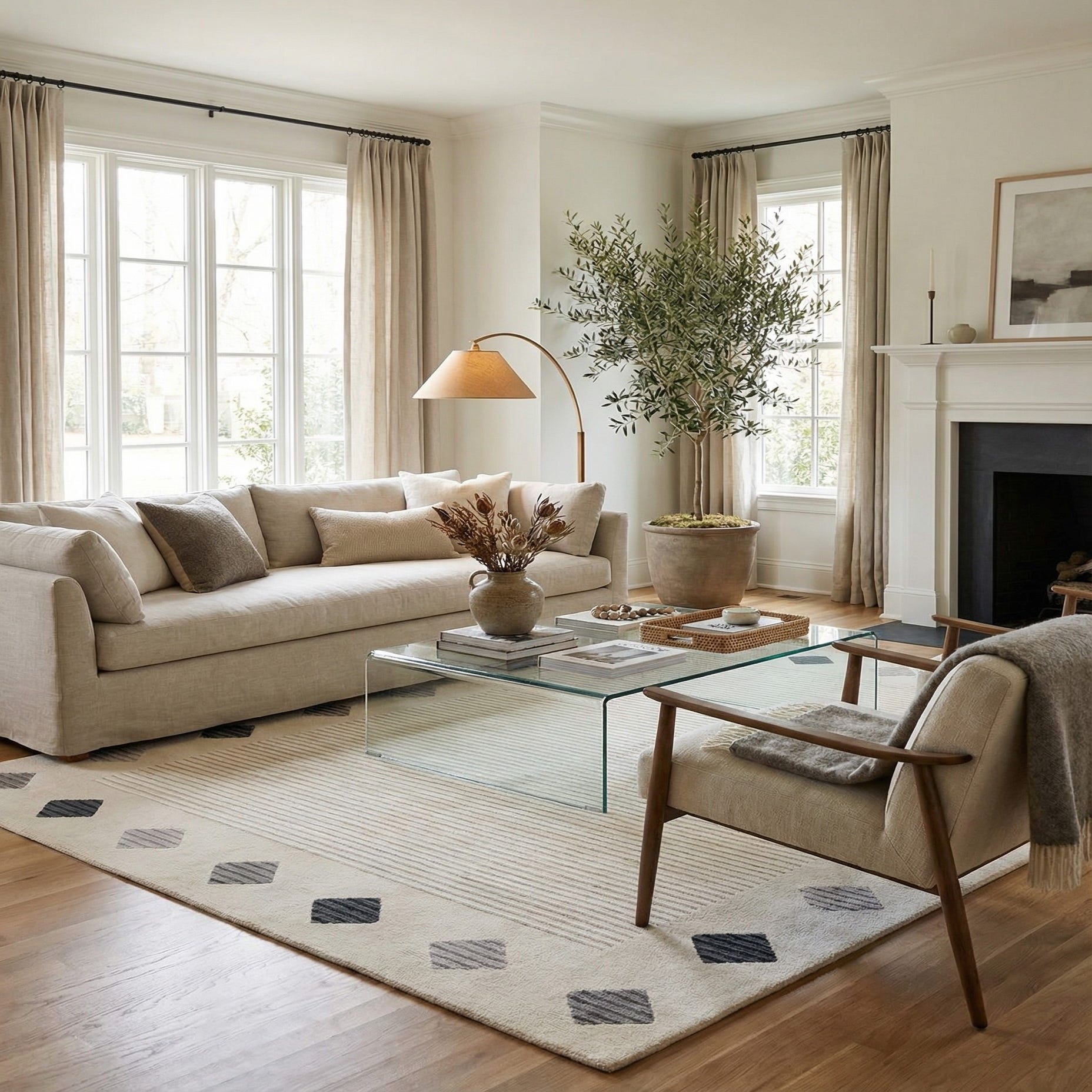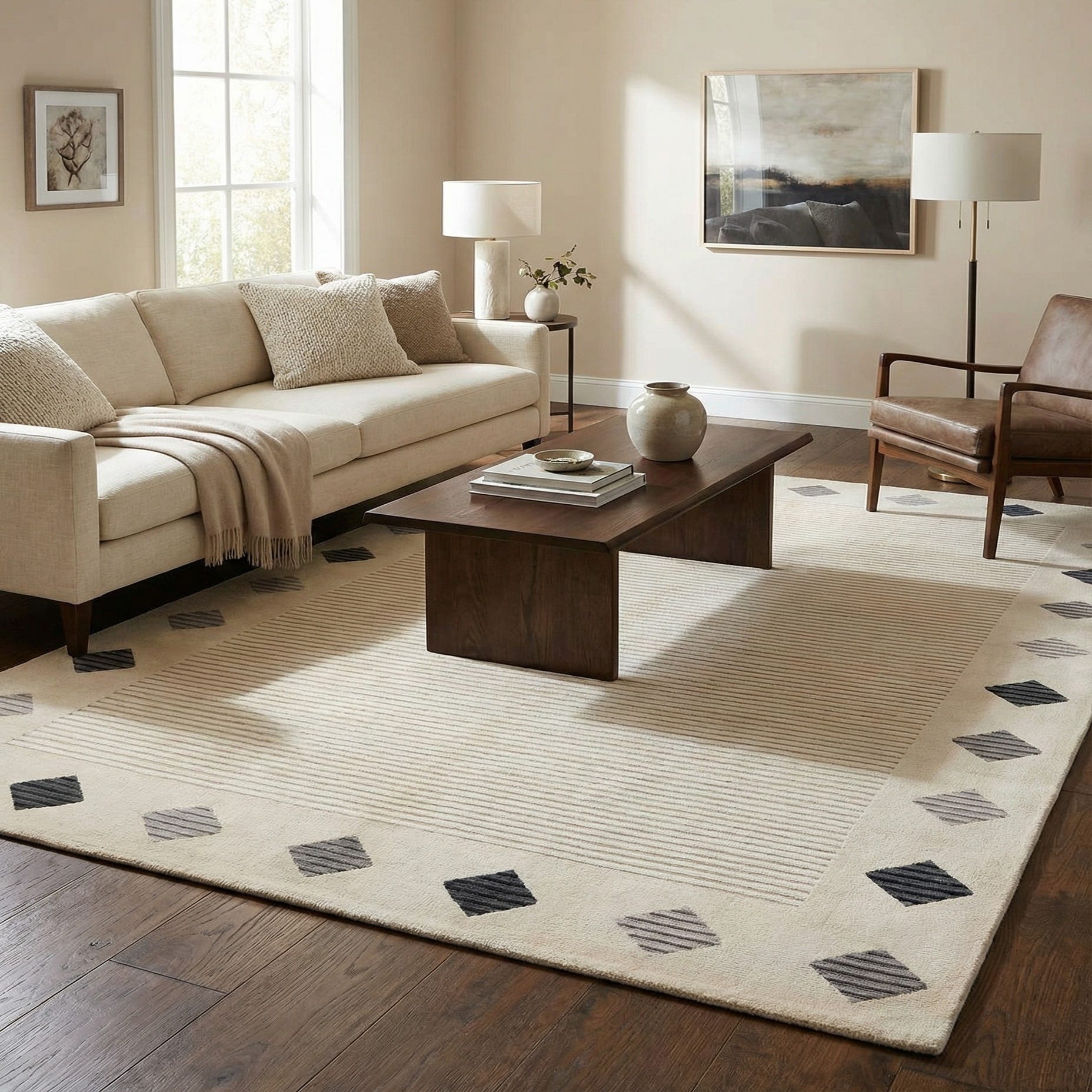 Primary color is Beige. Colors in this rug include: Beige, Black, Gray, Tan.