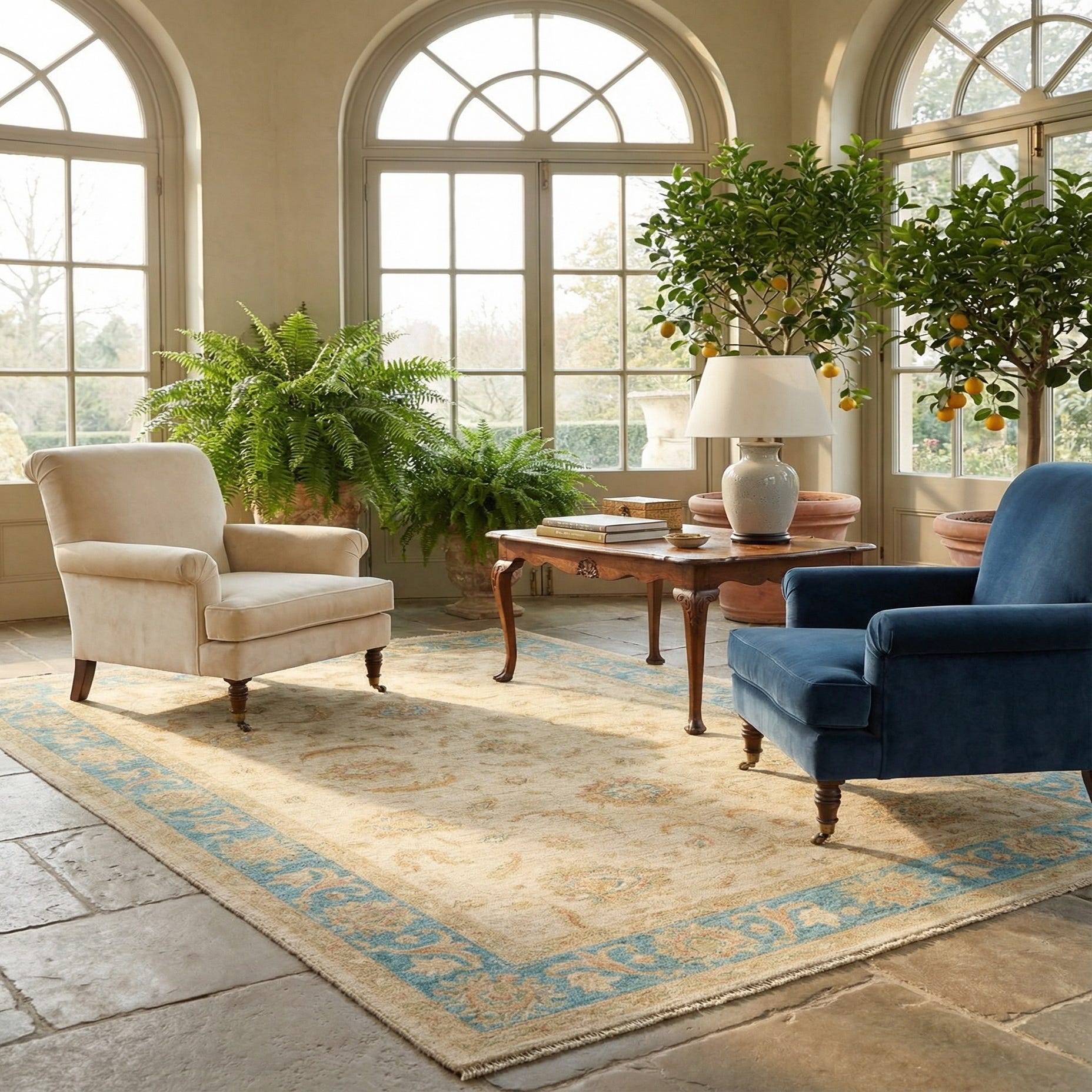 Primary color is Beige. Colors in this rug include: Beige, Beige, Turquoise.