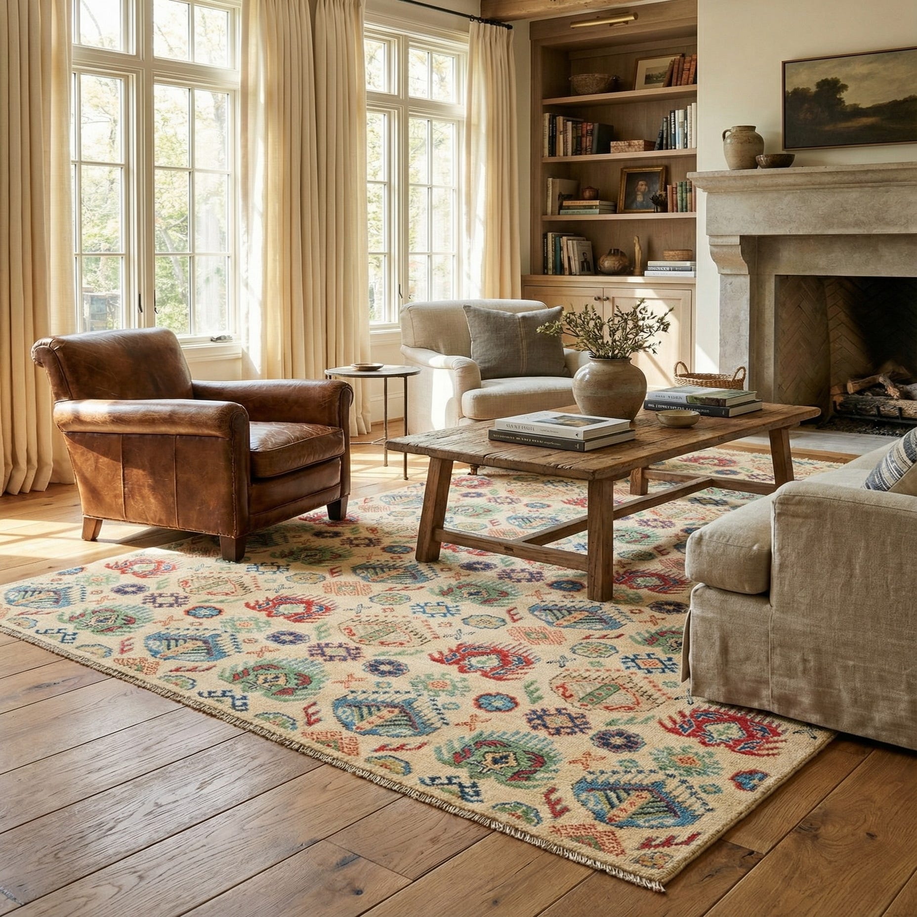 Primary color is Beige. Colors in this rug include: Beige, Blue, Brown, Gold, Green, Navy Blue, Red.