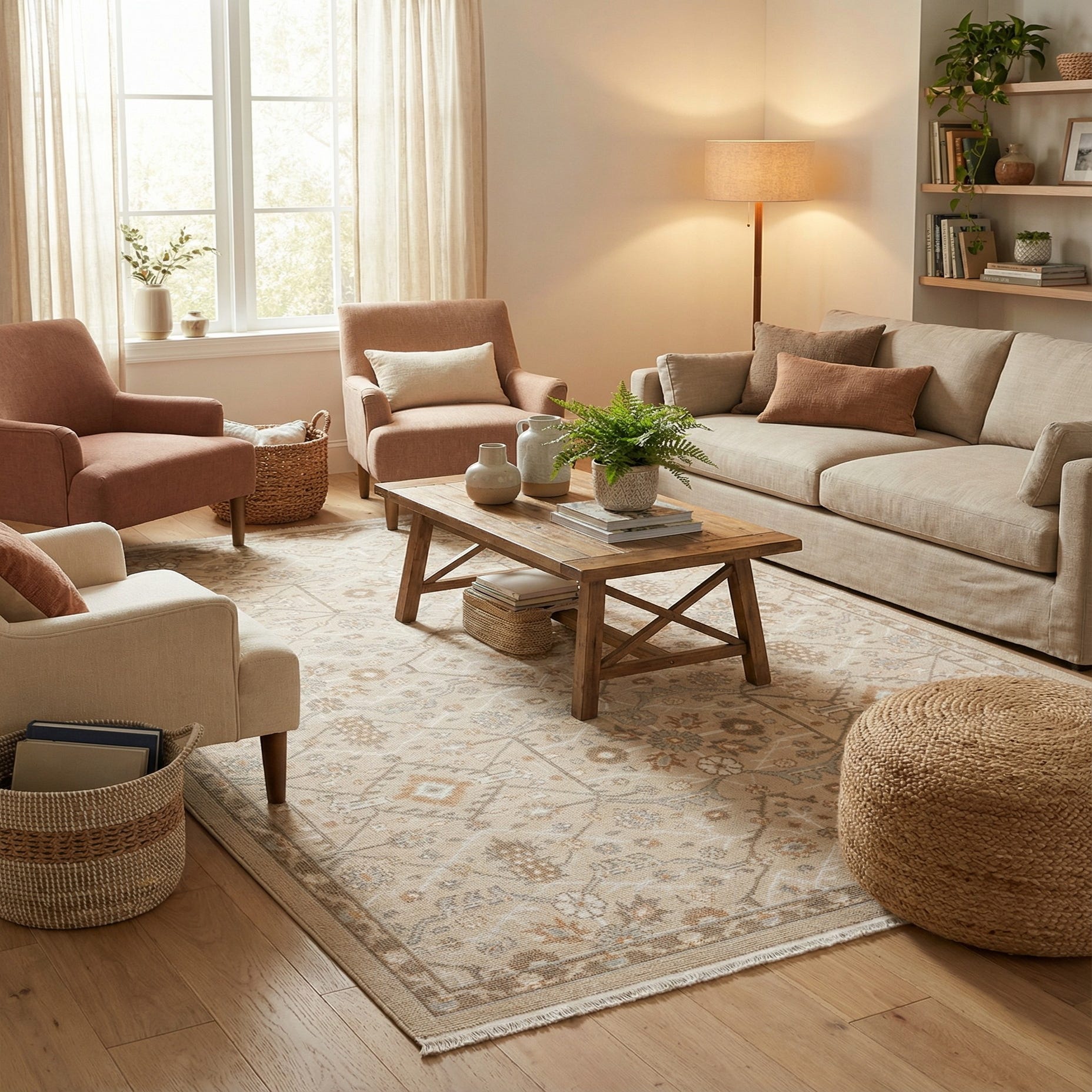 Primary color is Beige. Colors in this rug include: Beige, Black, Brown, Ivory, Gray.