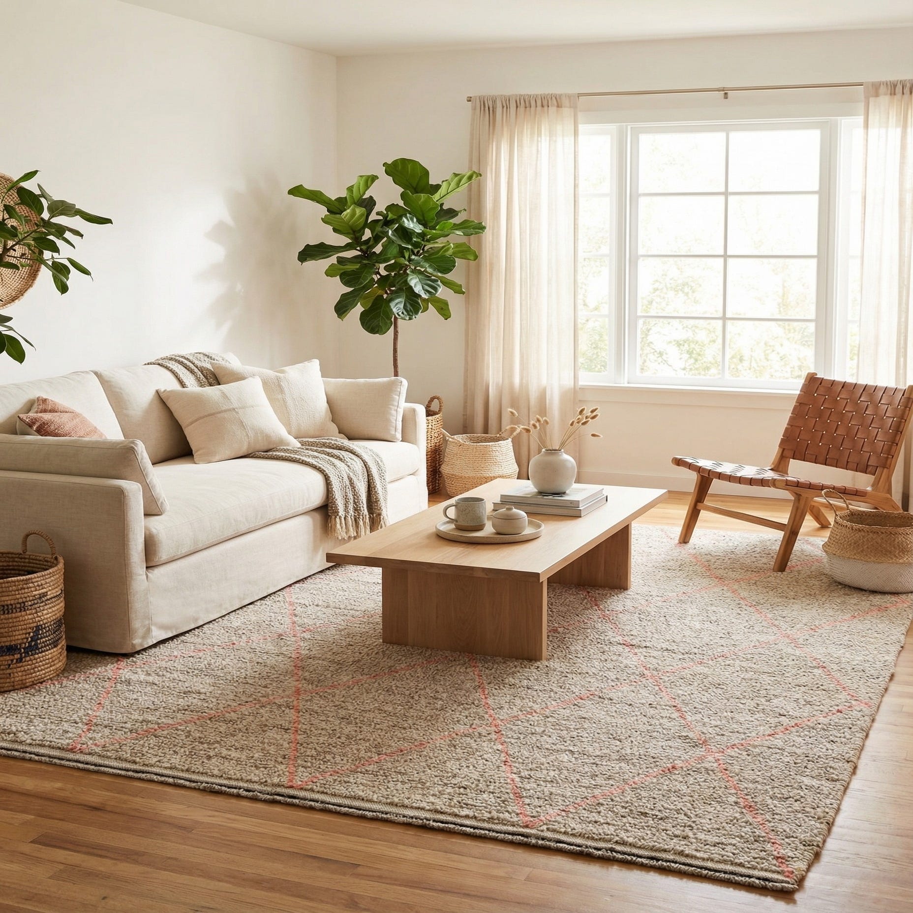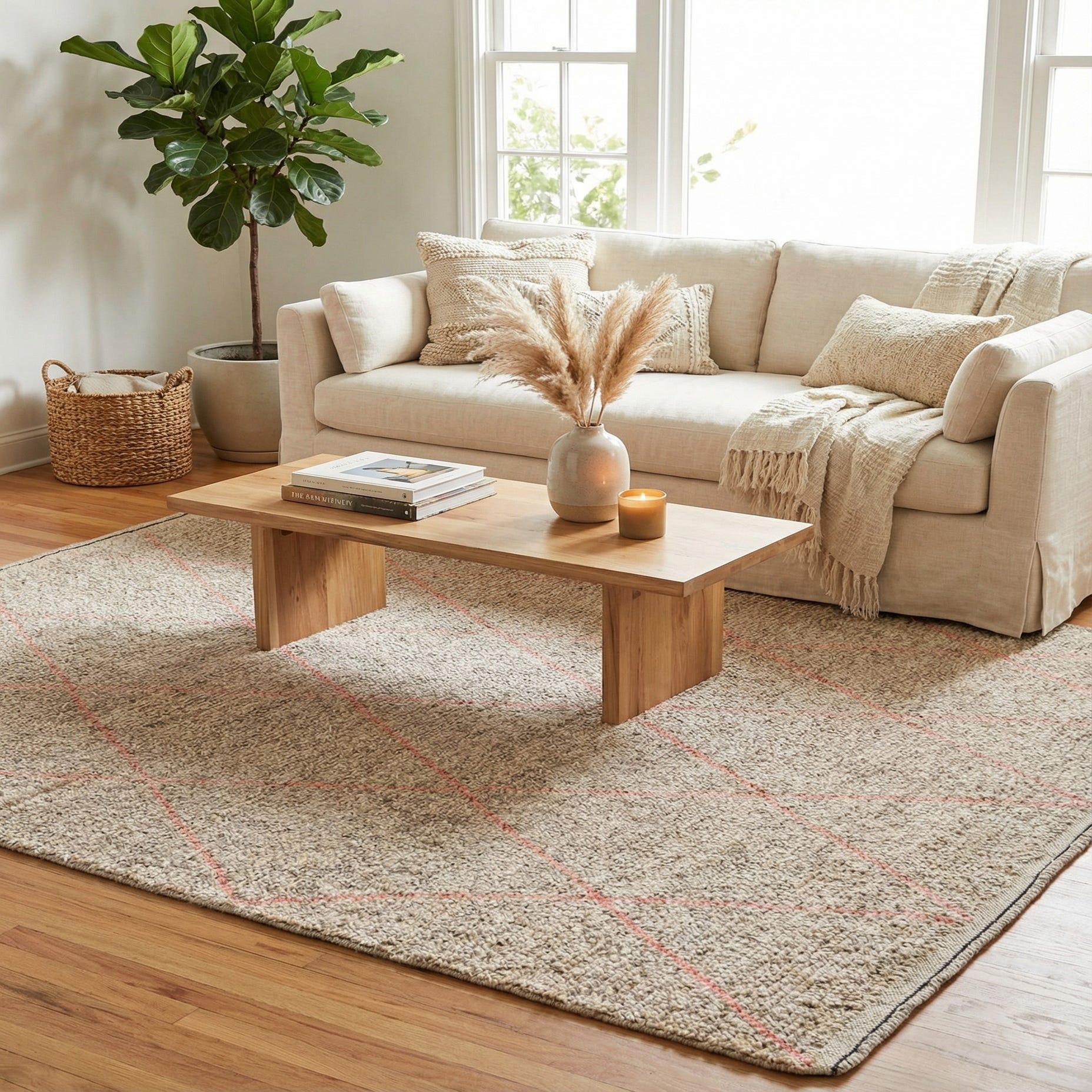 Primary color is Beige. Colors in this rug include: Beige, Brown, Pink.
