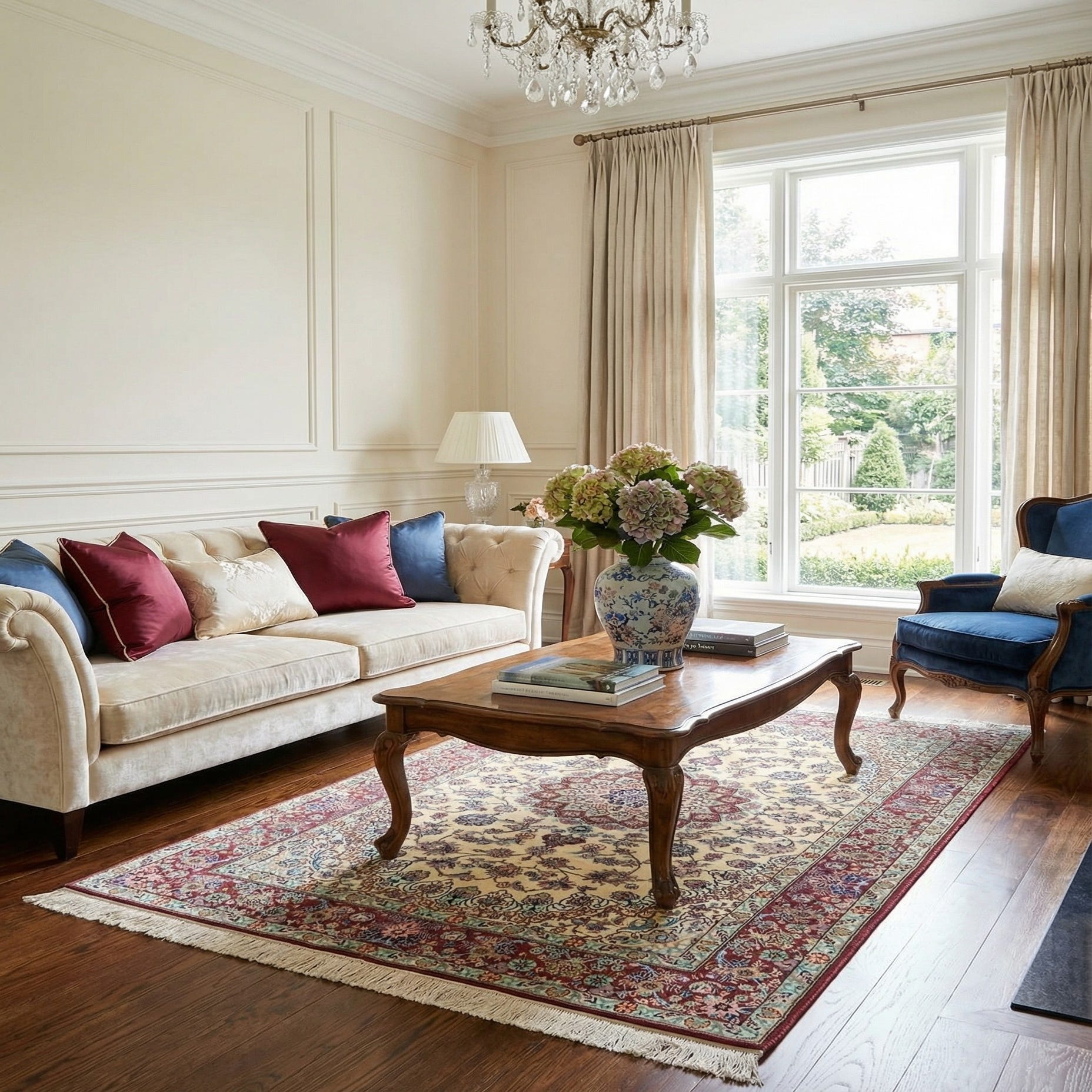Primary color is Beige. Colors in this rug include: Beige, Brown, Red.