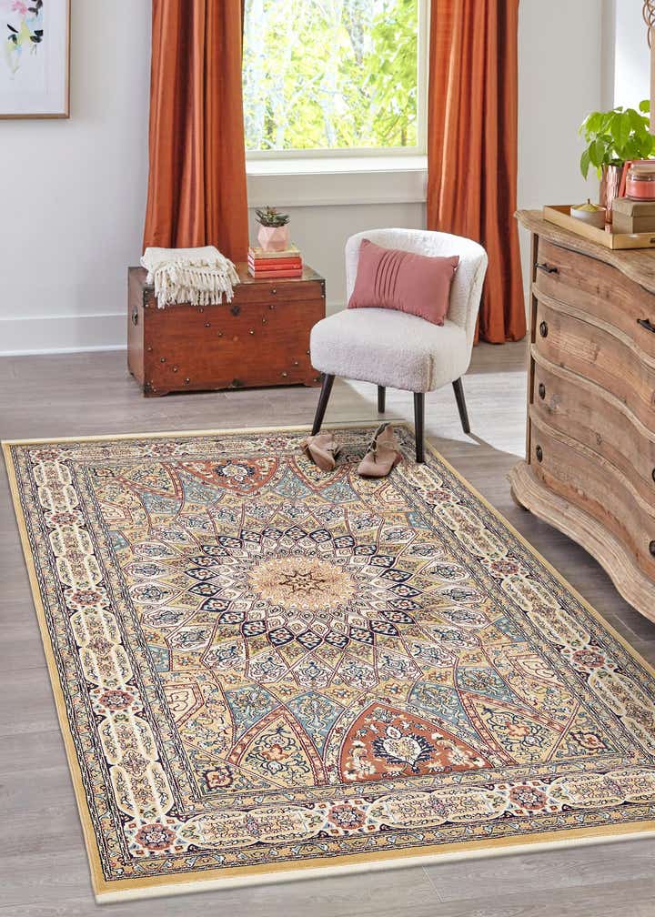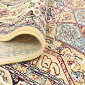Primary color is Beige. Colors in this rug include: Beige, Blue, Burgundy, Cream, Green, Ivory, Navy Blue, Puce.