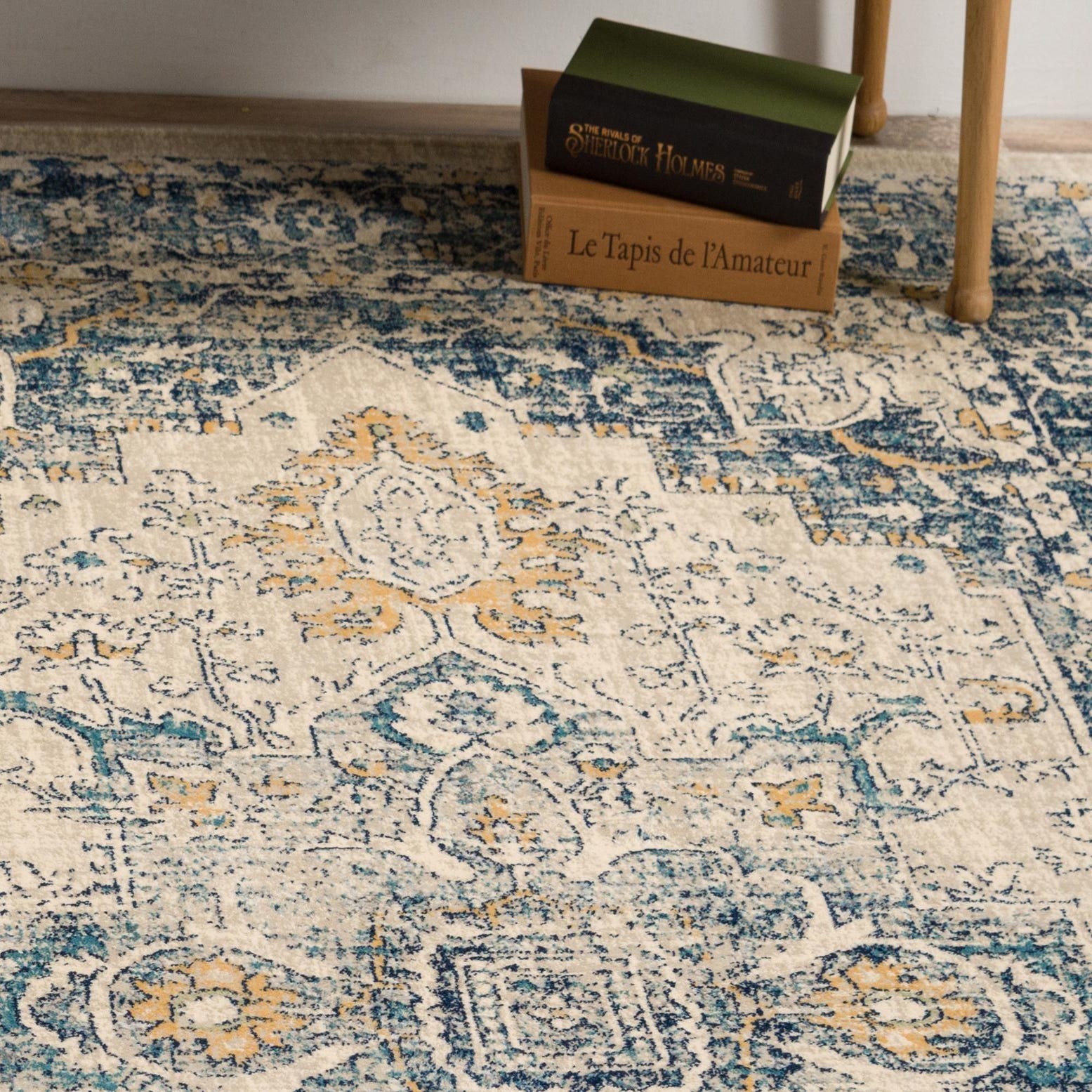 Primary color is Beige. Colors in this rug include: Beige, Blue, Navy Blue, Tan.