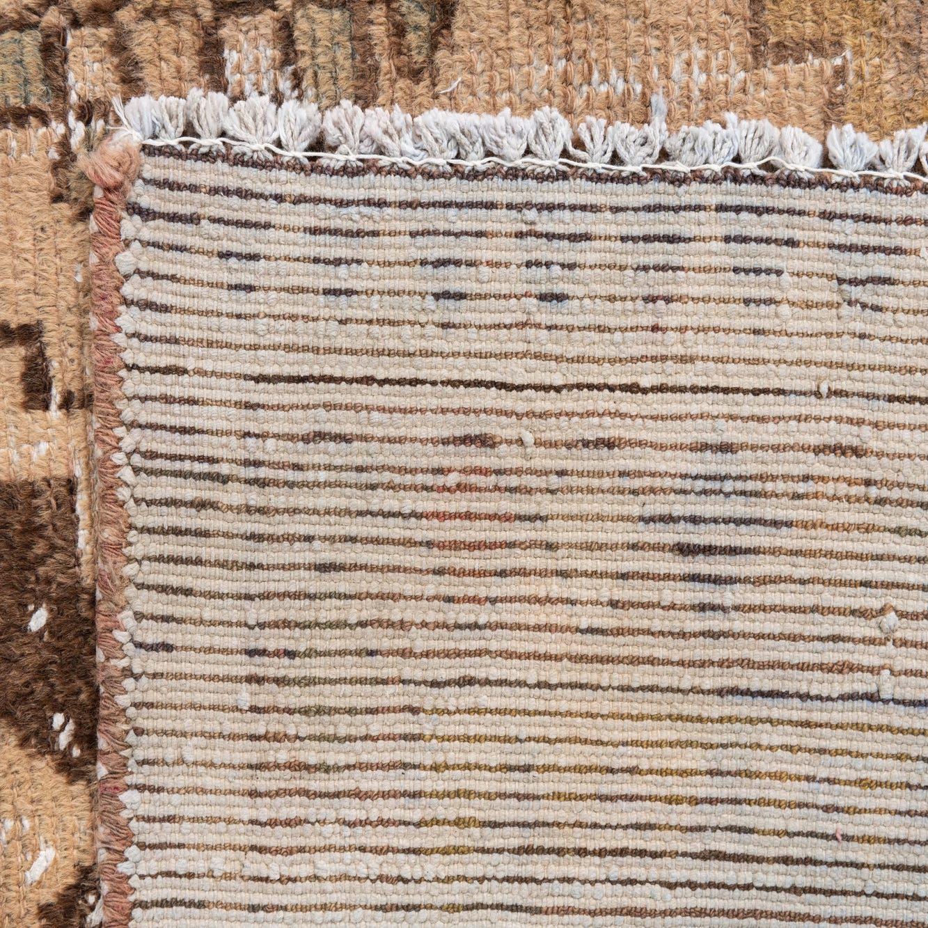 Primary color is Beige. Colors in this rug include: Beige, Brown, Navy Blue, Green, Gold.