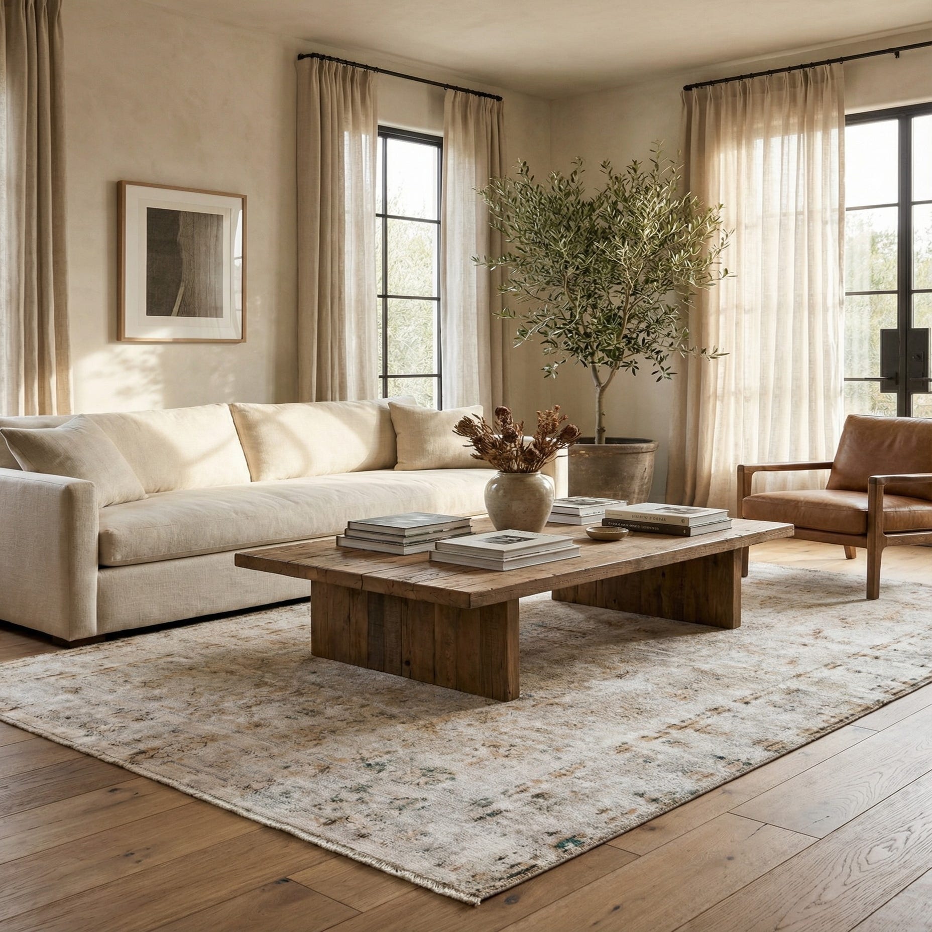 Primary color is Beige. Colors in this rug include: Beige, Brown, Navy Blue.
