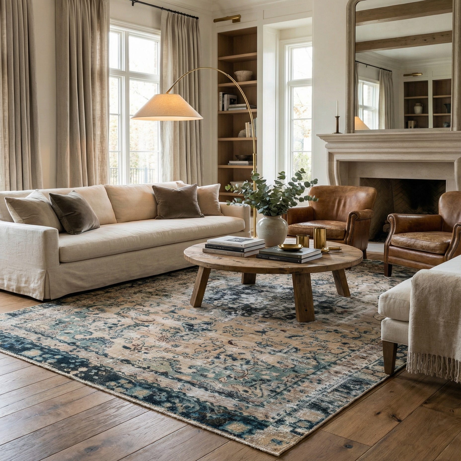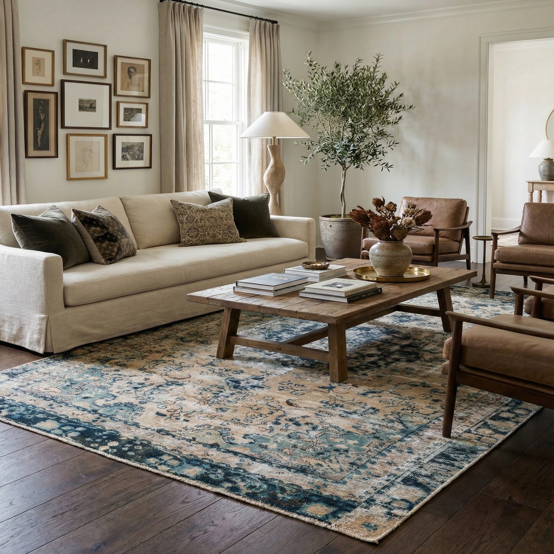 Primary color is Beige. Colors in this rug include: Beige, Brown, Navy Blue, Ivory.